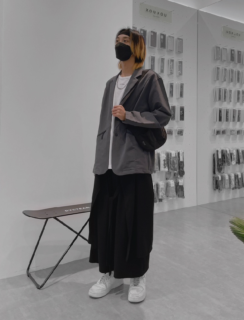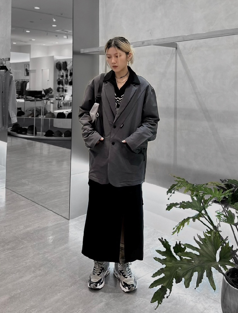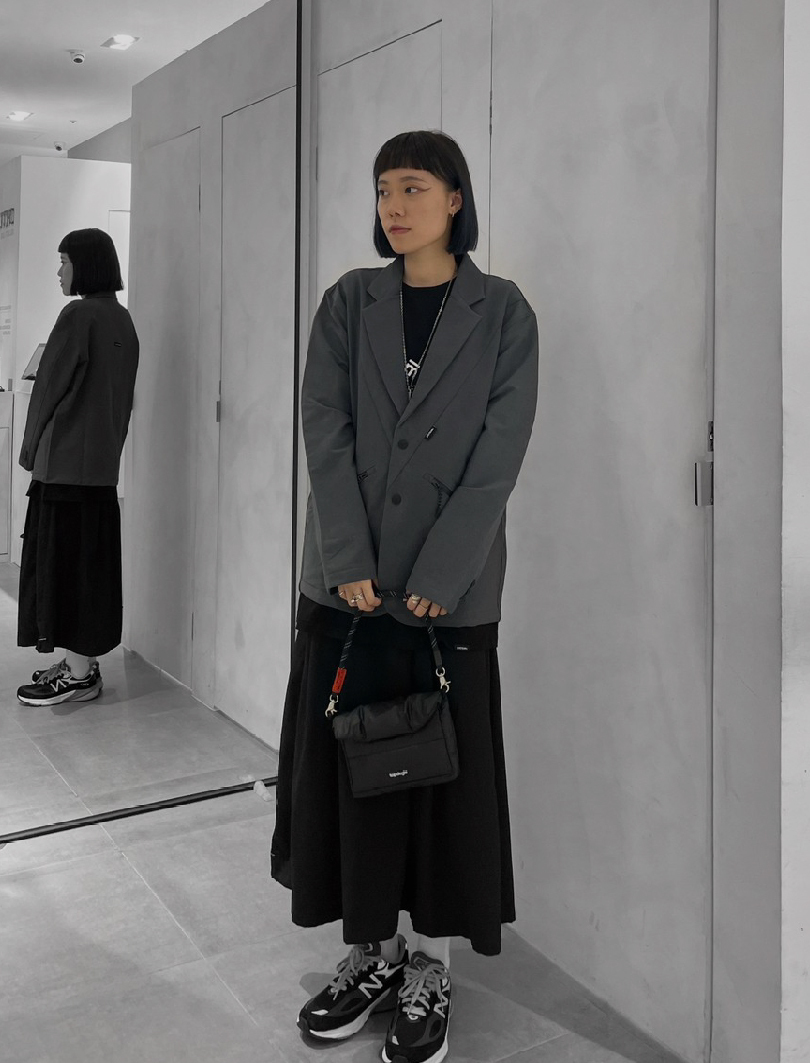 除了全身灰色系的標準配色外,介於黑白之間的灰色自然也是能與黑白輕鬆搭配的,不論是三色搭配抑或是與其中之一搭配皆是相當百搭,只要切記將灰色作為全身配色主軸的大方向便不會出錯,並穿出不同於 All Grey 的層次感。