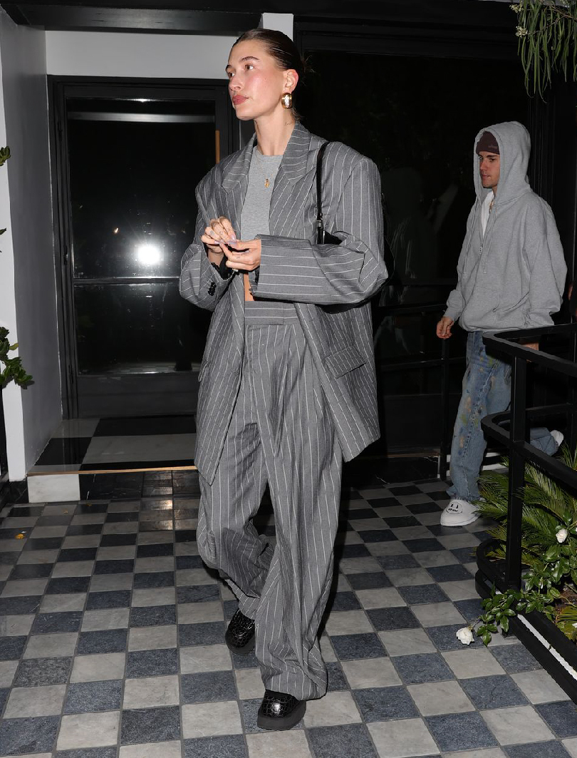熱愛西裝造型的海莉比伯(Hailey Bieber)教你怎麼駕馭全灰造型!穿著一套The Attico 鐵灰條紋墊肩西裝展現霸氣感,內搭淺灰短版上衣露出性感腰線,平衡線條硬朗的西裝版型。