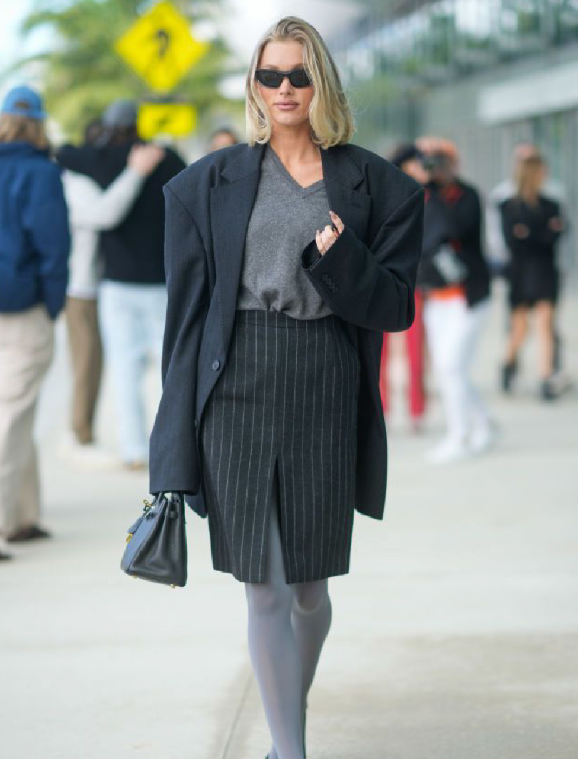 精靈系超模Elsa Hosk化身80年代復古女郎,身穿一件墊肩西裝外套、灰色毛衣、鉛筆裙和淺色褲襪時髦亮相,以不同色調的灰色增加層次變化,打破大家對於中性色調單調乏味的印象。