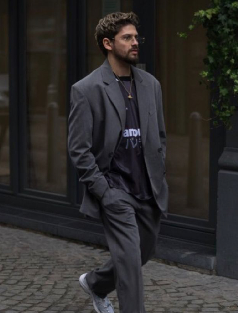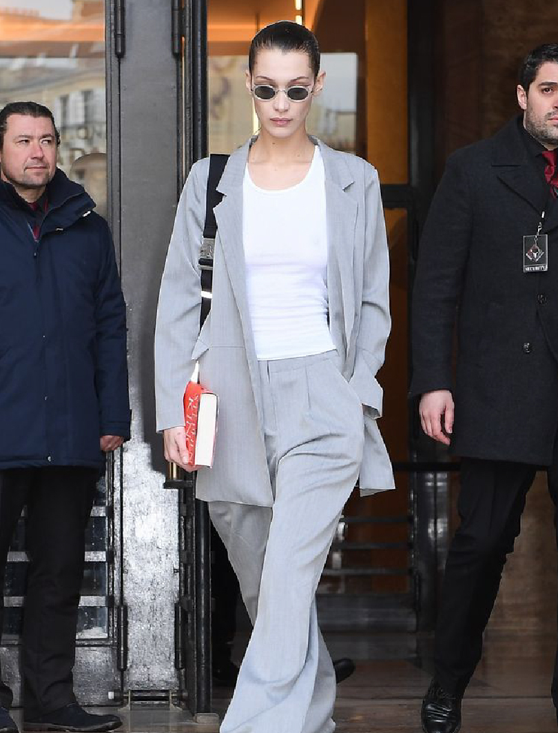 和Emily Ratajkowski的格雷系穿搭有著異曲同工之妙,超模Bella Hadid穿著一套淺灰西裝作為穿搭重點,但不同之處在於白色背心和球鞋的搭配選擇,整體造型顯得更加乾淨俐落。