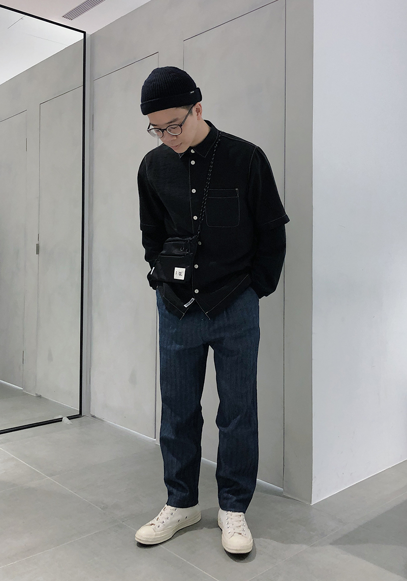 因為DYCTEAM 的特色之一就是以大眾都能接受的色系做設計,像是黑、白、藍等,那在基本色之下要如何走的不基本,我們可以從布料或設計上的細節去著手,像身上這來自丹麥的wood wood襯衫,我很喜歡布料有些微的皺摺感,從細節營造出愜意的氛圍,而且主要成分是天絲,本身帶有涼感親膚的特性很適合台灣的夏季。
