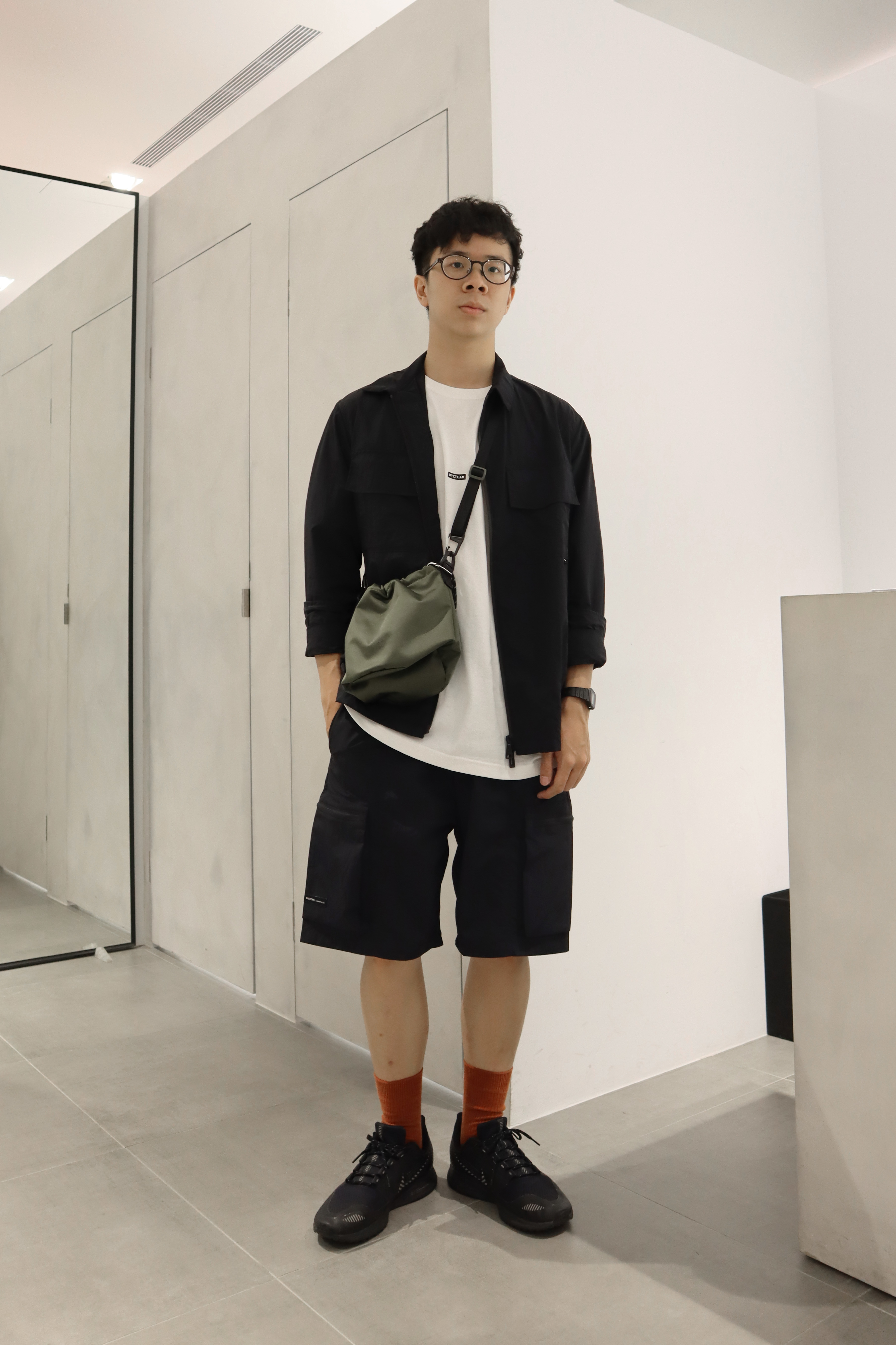 但單純的上衣、短褲,這樣的穿著有時候會略顯無聊,所以也在外面搭上一件 Recycle 系列的夾克增加層次,這款外套不只是採用回收的環保面料,還具備防潑水和防曬的功能,輕薄的特性在夏天穿起來也不會這麼有負擔感。
