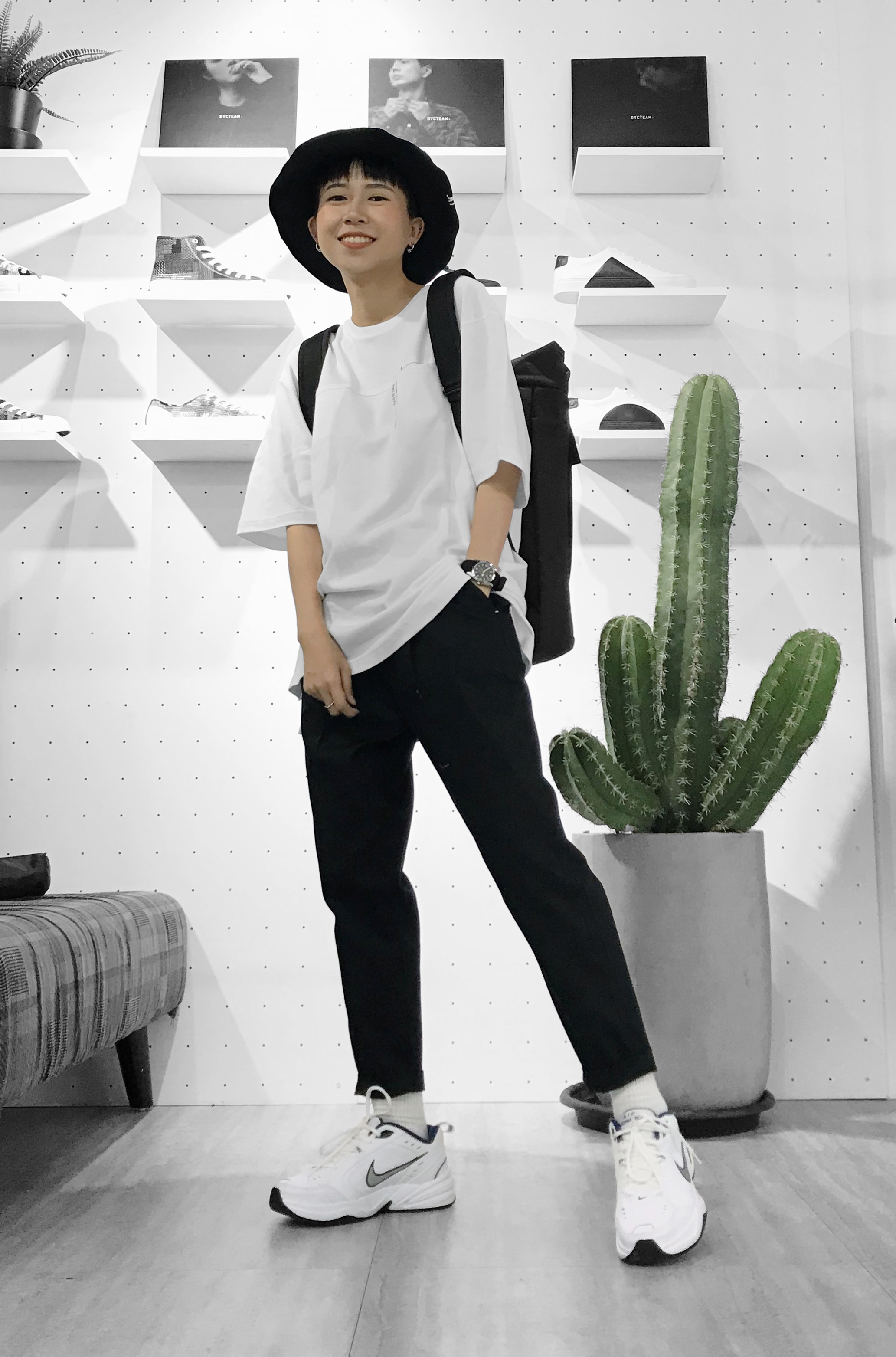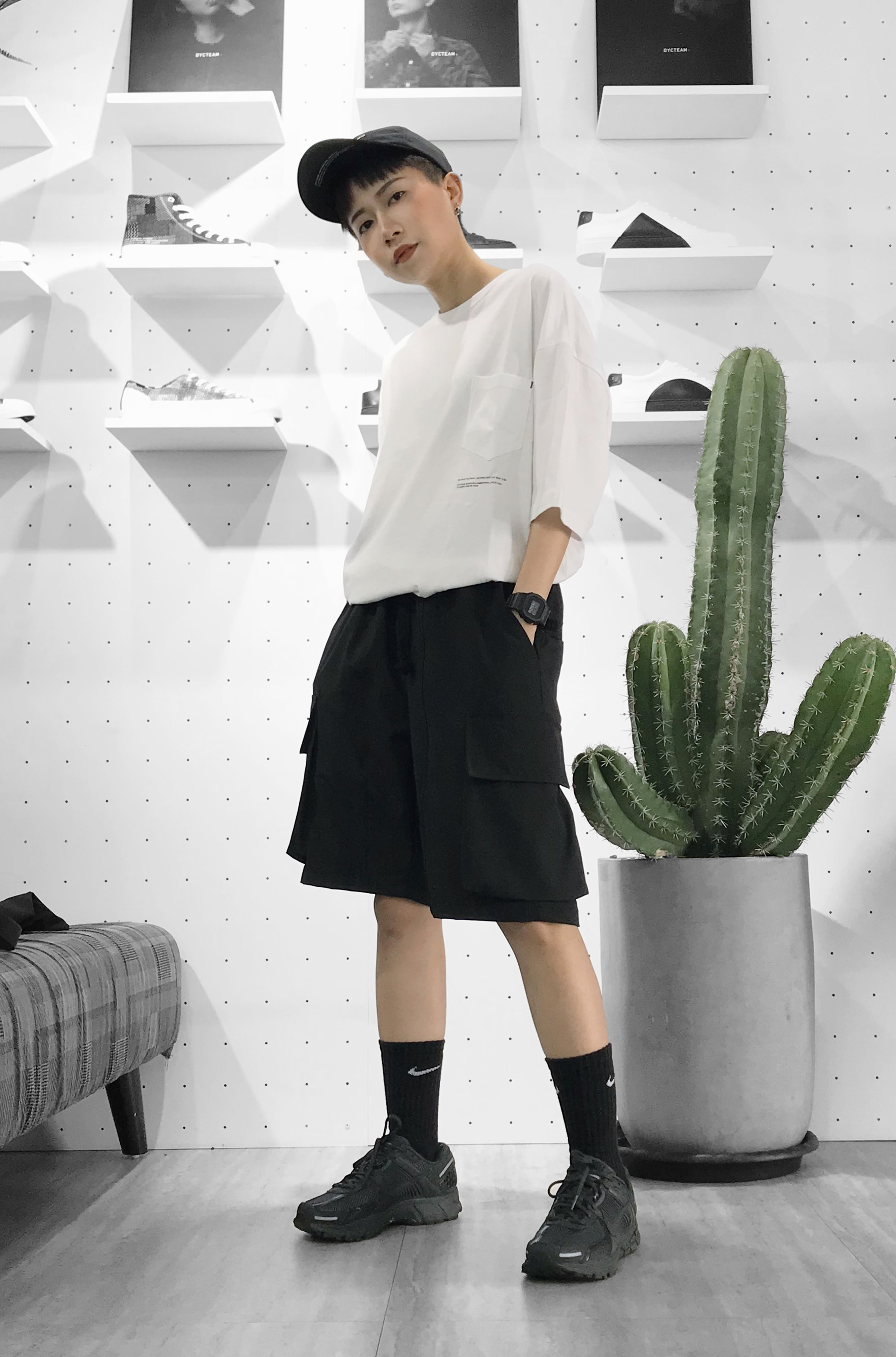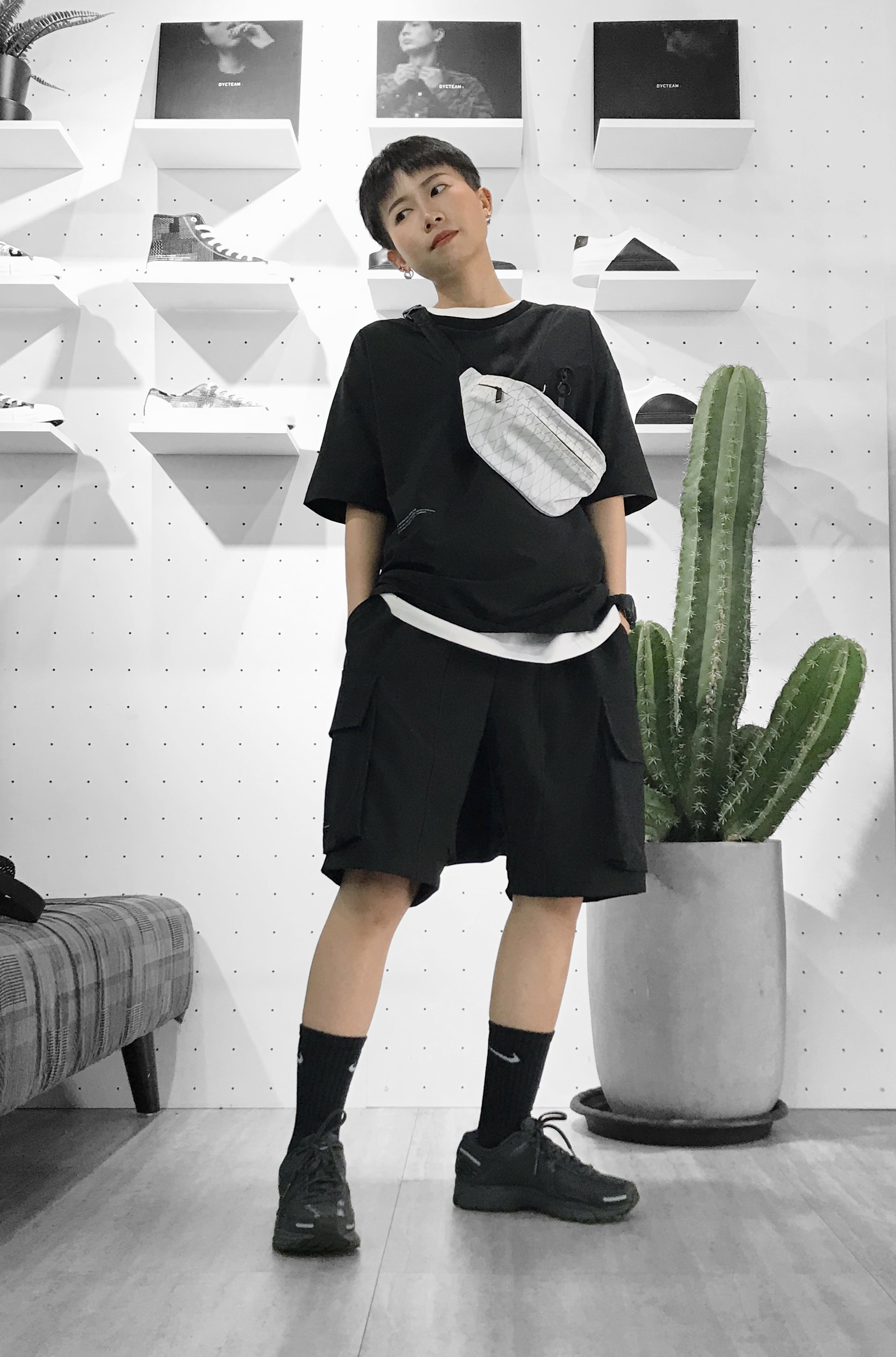 一樣是使用上寬下窄的穿搭模式選了五分落肩版型的白色上衣,修身的九分錐形褲,足部的搭配以白色為主與上身搭配,整體更簡單清爽,可以根據當日的行程更改鞋款,例如更正式的場合可以換成皮鞋,近郊出遊可以拖吊襪子換成涼拖鞋,與UCON ACROBATIC這款COLIN犀利黑都非常適合。