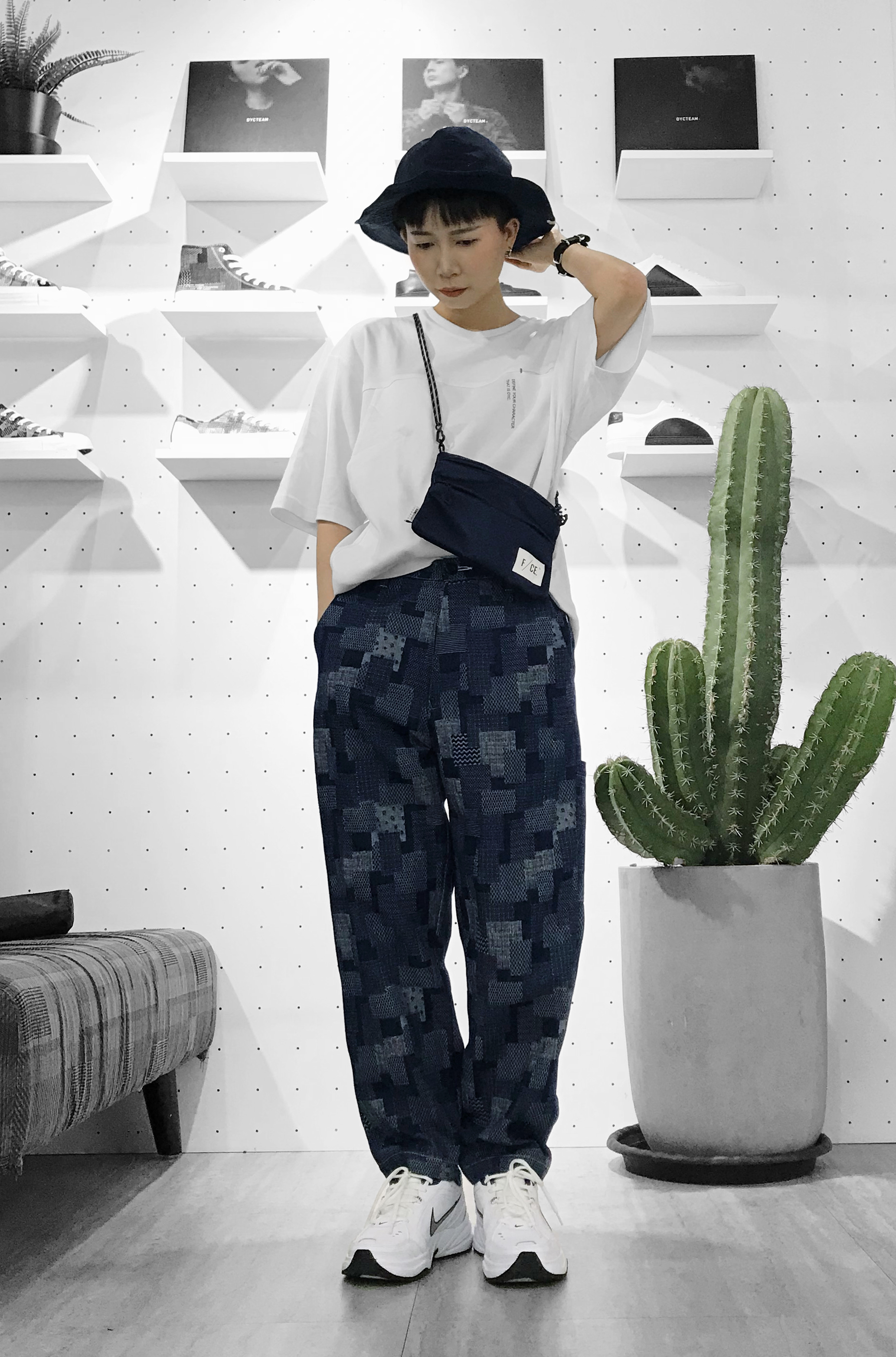 上面介紹的帽子也有深藍色版,戴起來又是另一種風格,這套選用藍色與白色的搭配,下身褲子刻意選了大一尺碼製造直筒褲感(原本是九分褲),因緹花顏色較豐富,我會直接把它作為主角,包款便選了最簡單也是人見人愛的F/CE補給袋,整套的焦點不會偏移,卻也不會花俏,甚至這款帽子還更有加分作用。