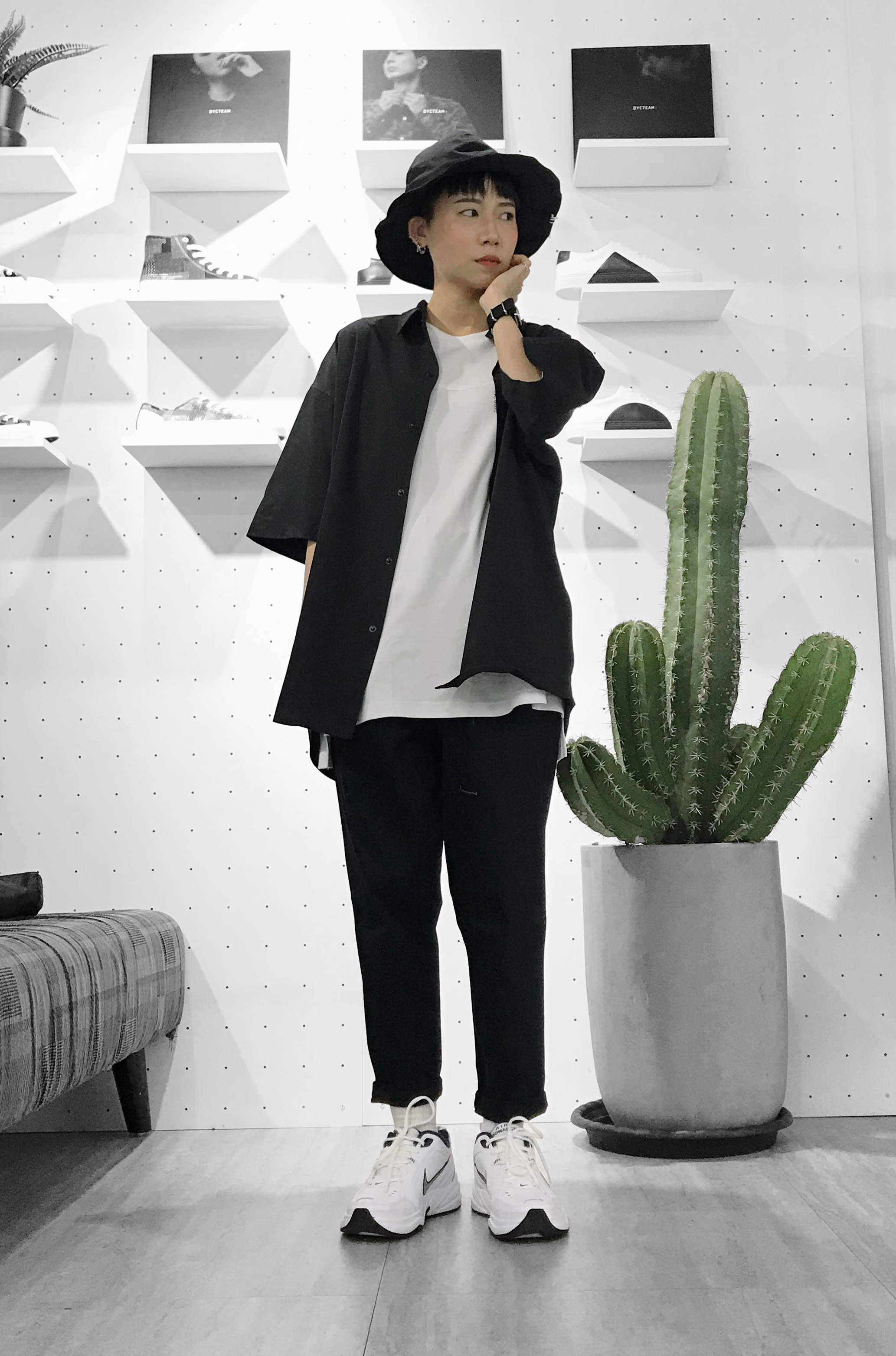 這組黑白色的日系風格完全是意外產物,歸功於頭上這頂寬帽,在台灣的街上比較常看見老帽、水兵帽、漁夫帽,再更寬沿的帽型偏少,建議在選用這款帽子時可以讓身上的單品越簡單越好,更能凸顯帽子的特色,若太過複雜反而只會覺得帽子是多餘的配件。