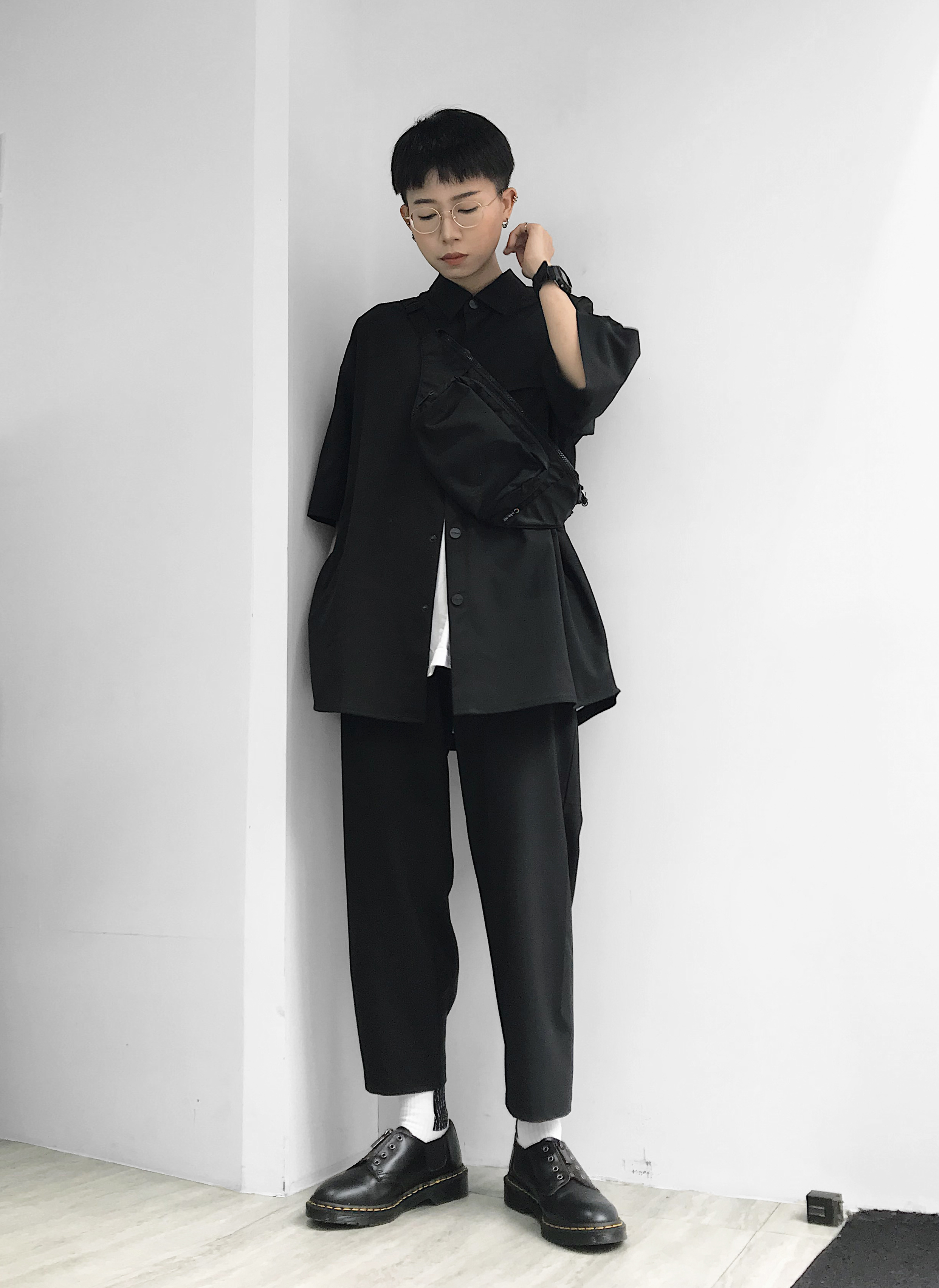既然主題要呈現商務,還是從比較基本簡約的款式下手,黑白色系的穿搭已經在DYCTEAM select shop司空見慣,刻意挑選有領子的襯衫當外搭,只扣局部釦子來增加一些飄逸感不讓上身厚重,飄逸感的選擇在材質上有很大的關係,身上這款五分袖襯衫因為是機能面料也是夏季材質所以非常合適,若想用類似單品搭配在材質上則是避免選較於硬挺的斜紋面料,整體的穿搭氣場會較適宜。