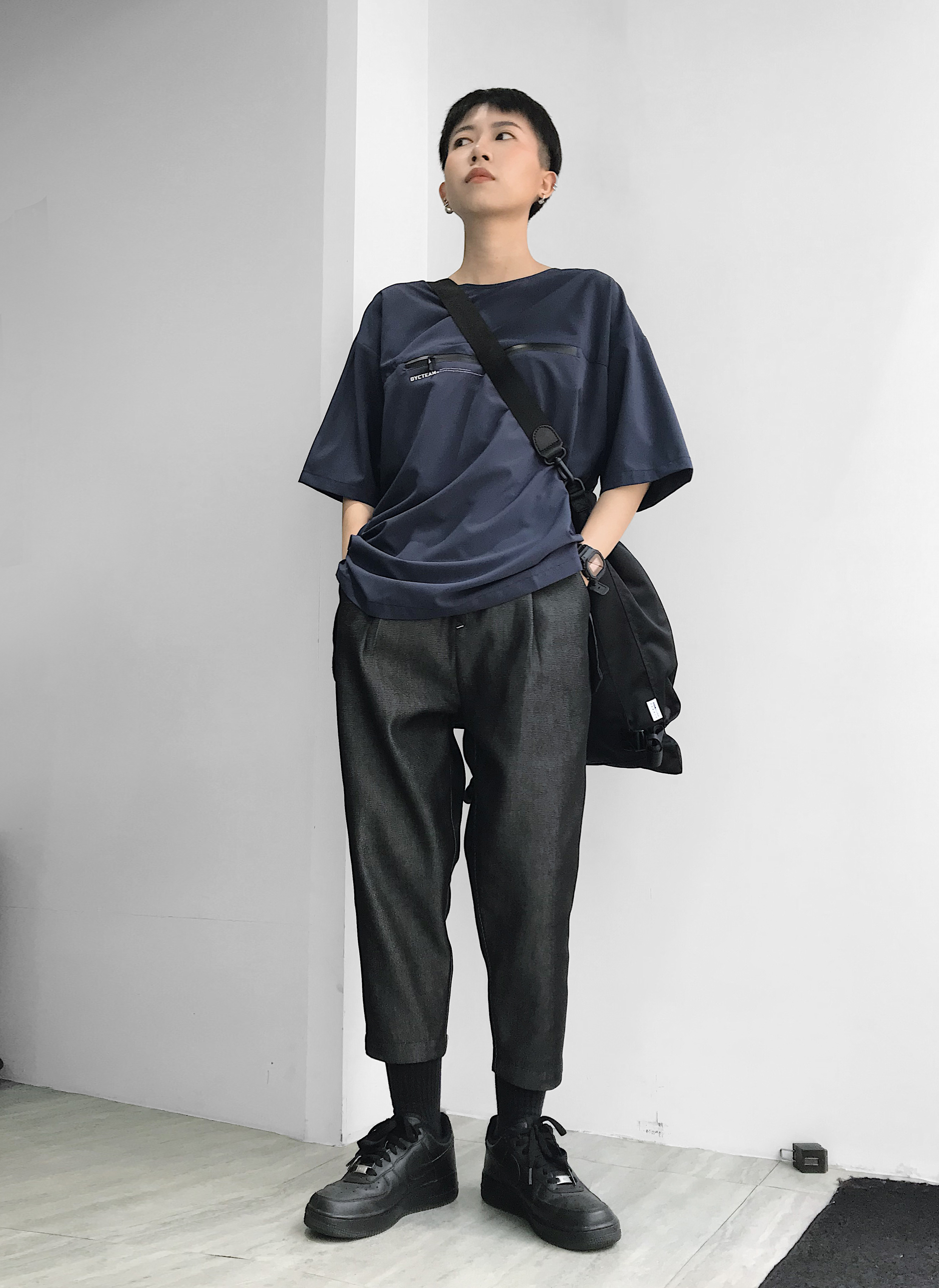 雖然前面說選擇輕薄的材質比較不會讓局部太過厚重,但這件黑色丹寧褲還是推薦給各位,屬於較挺的版型,不會到厚重但也不是薄料,褲長較短是八分褲型,相對露出襪子的部分會多一些,雖然我穿的是素黑襪,但若是想要不同的風格呈現一樣可以在襪款挑選上選擇細節較多的款式。