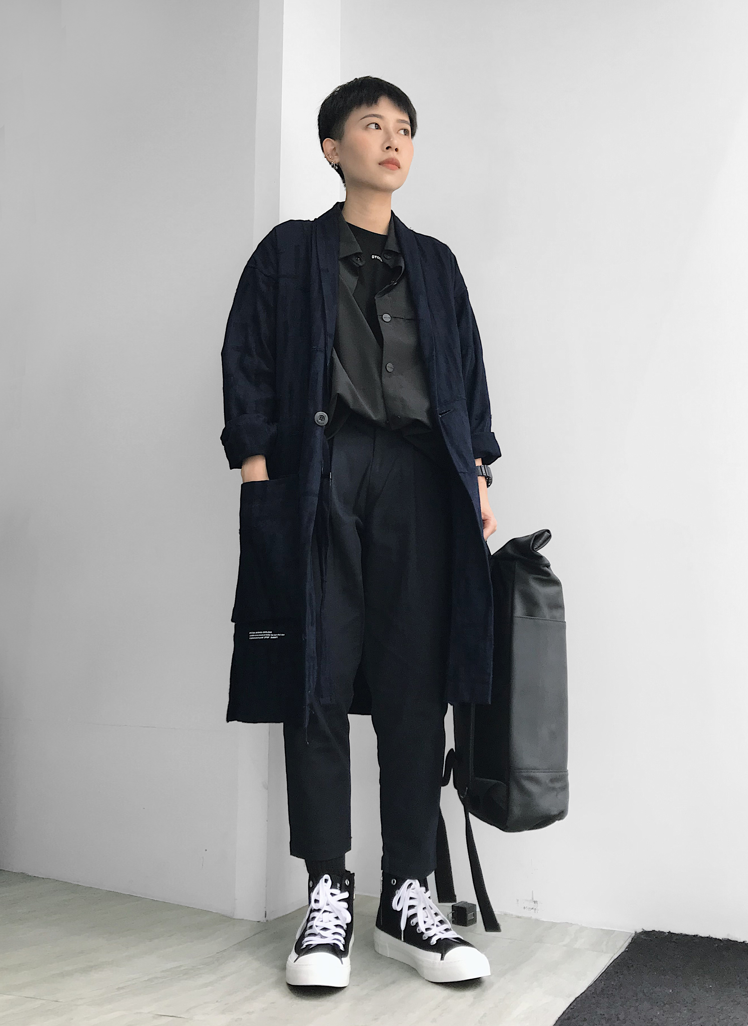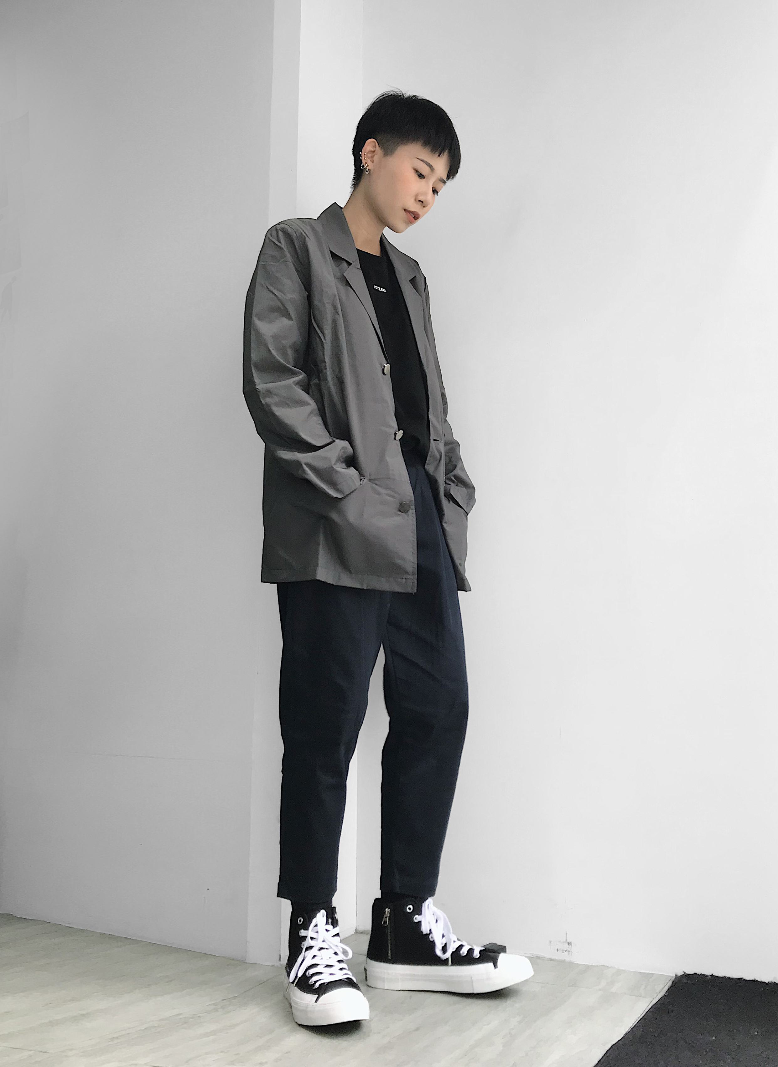 這套的下身偏向休閒,想穿搭出一套上下班皆合適的組合,故選擇了DYCTEAM的AIR MESH高筒帆布鞋,在面料印刷的呈現上具有細膩巧思。而整身使用到的顏色黑、灰、藍皆較屬於穩重色彩,鞋底的白色又更能添加豐富感。