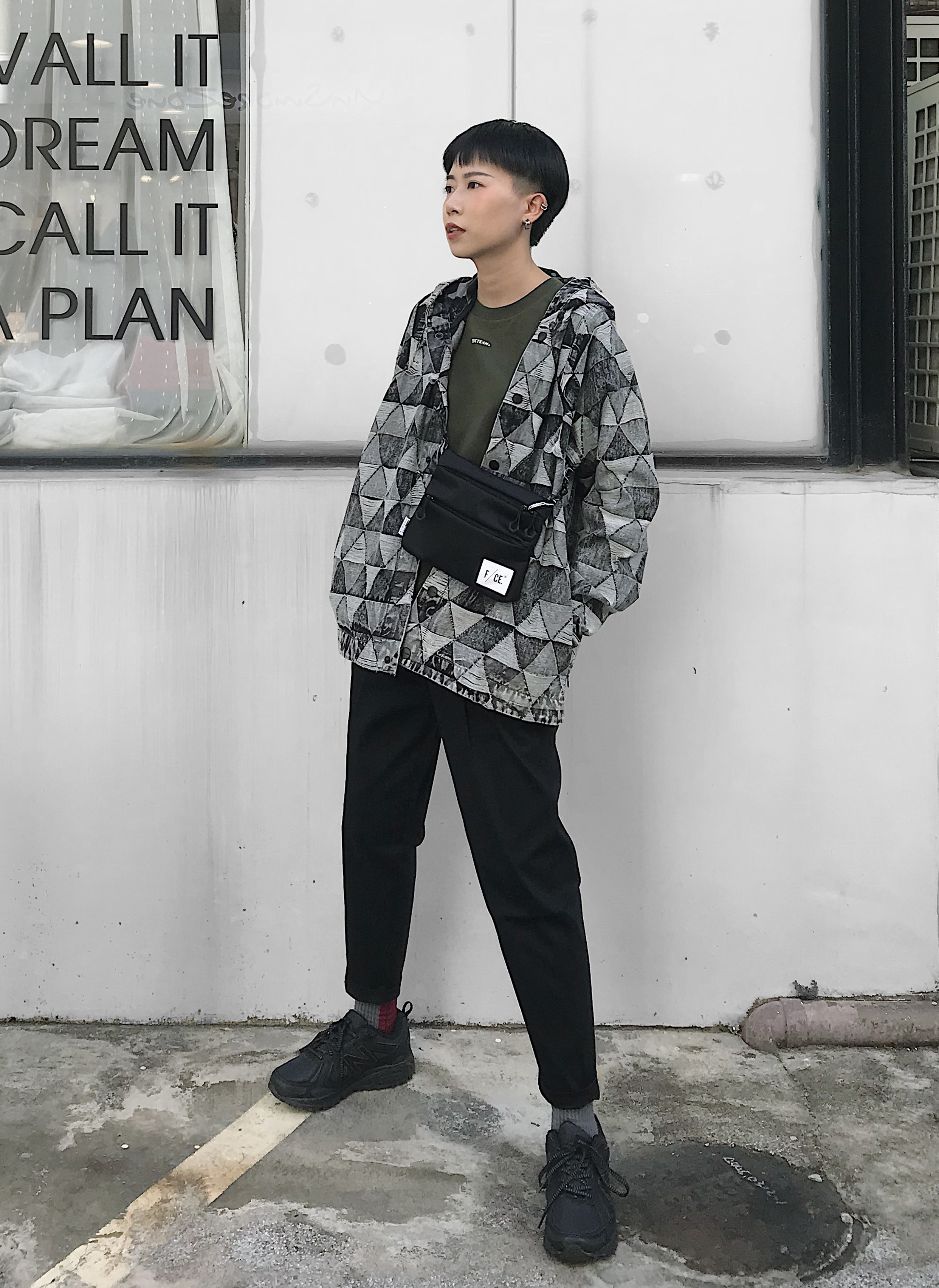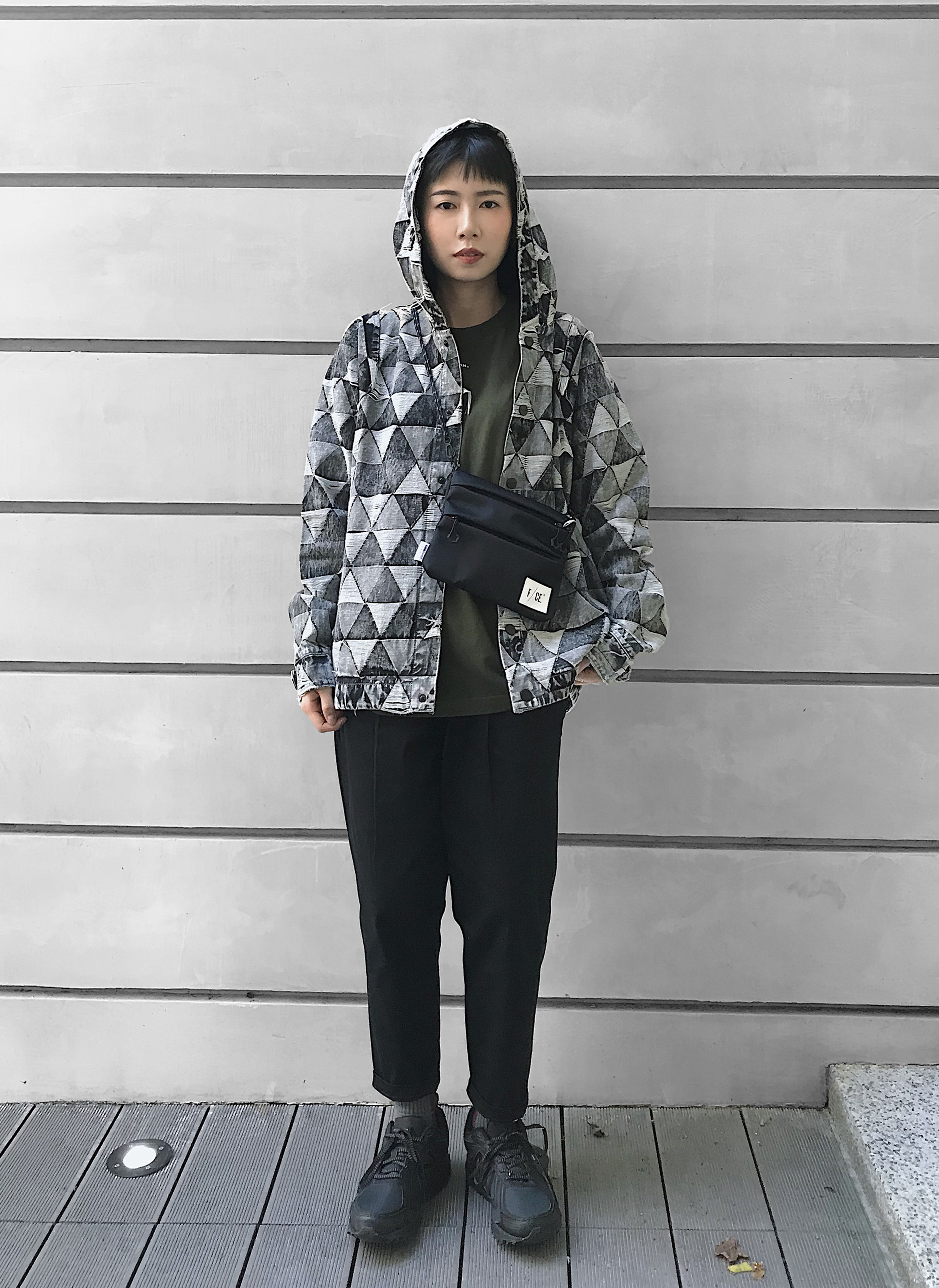 是不是覺得外套很陌生?對!就是你想的那樣,這件三角格連帽外套是新一季19AW的單品之一,在過去幾季我們比較熟悉的是藍色的丹寧緹花,而在DYCTEAM 19AW中新的水洗效果產出黑色緹花面料,更能夠讓不太喜歡滿版花色的朋友眼睛為之一亮。