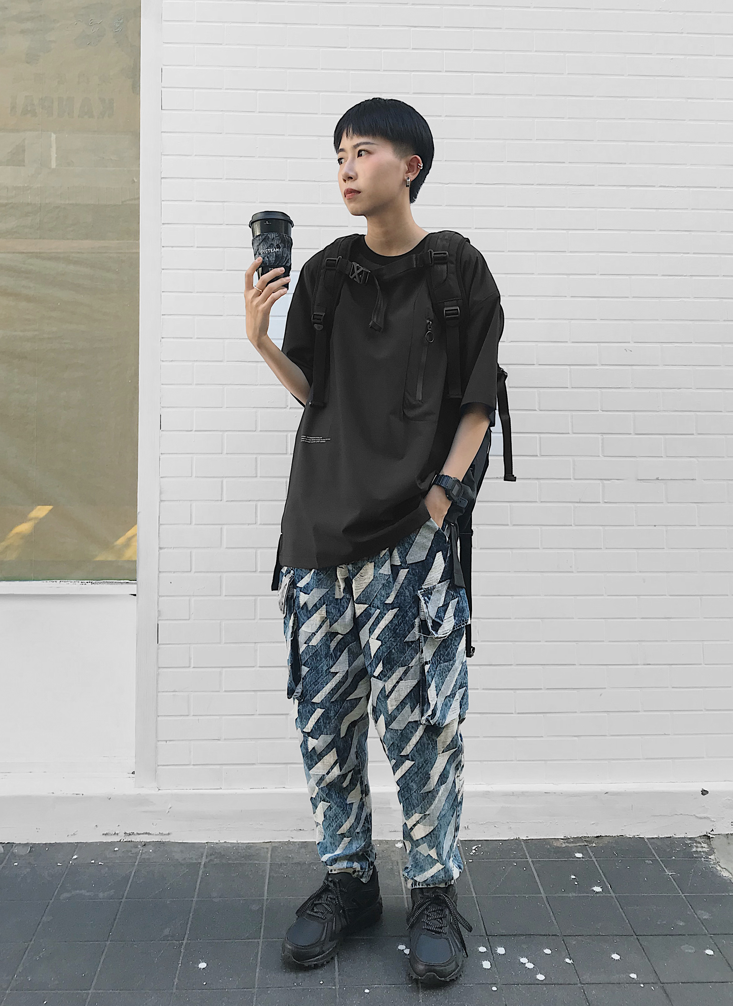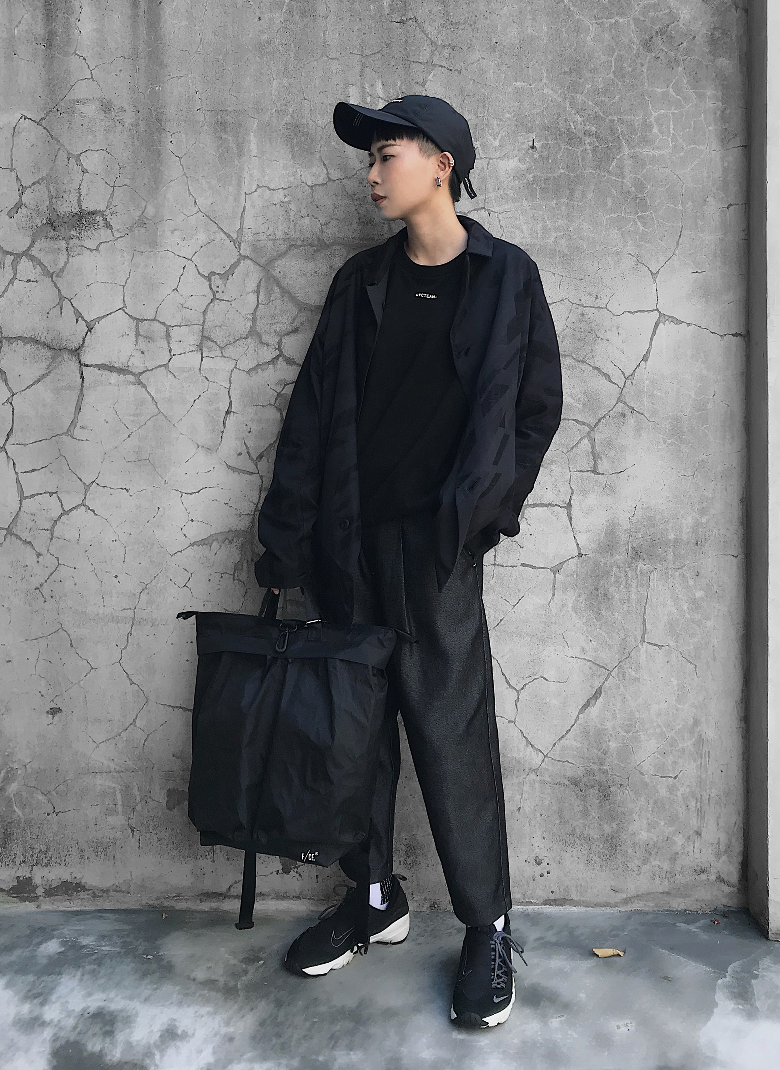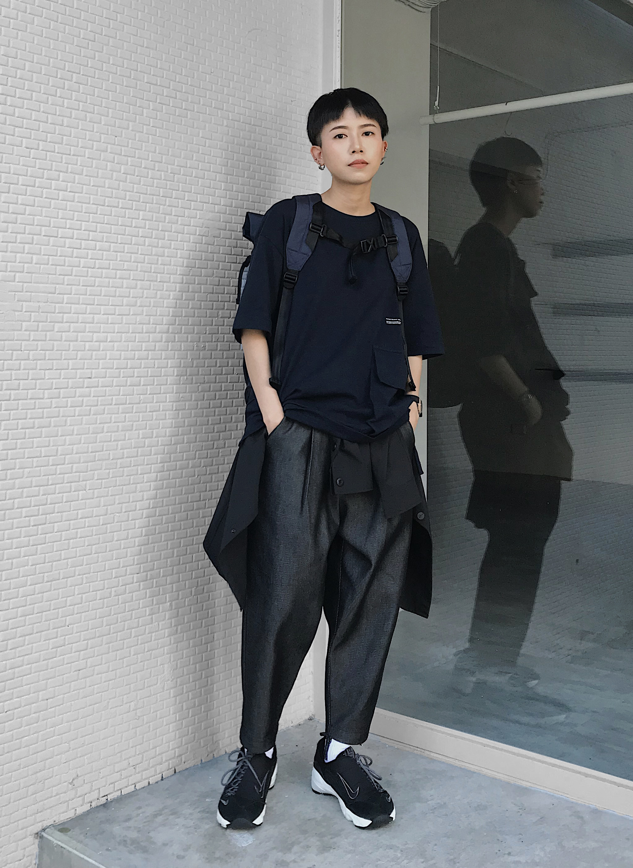 上身這件落肩立體口袋TEE即是兩週前DYCTEAM上架的CC系列新品,共有黑白藍三色,保有一貫品牌的風格,寬鬆版型、前短後長、兩側開岔,這些小細節看似簡單卻皆能夠在穿搭上有更多可能,舉例這套腰間綁的襯衫,若上衣條件不足(不夠寬身、兩側無開岔)可能就會造成股包,讓人覺得你腰很卡很肥的錯覺!
