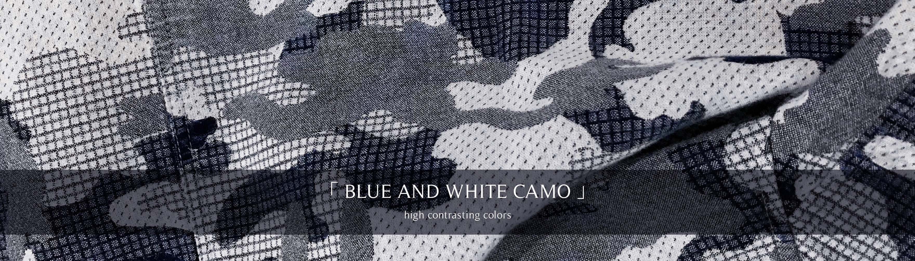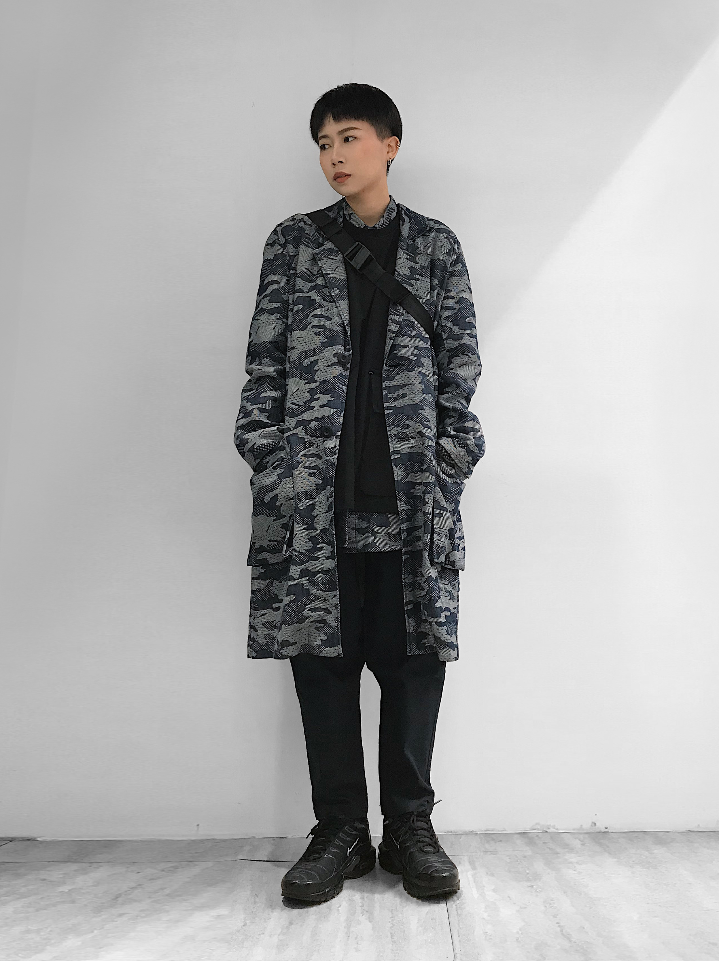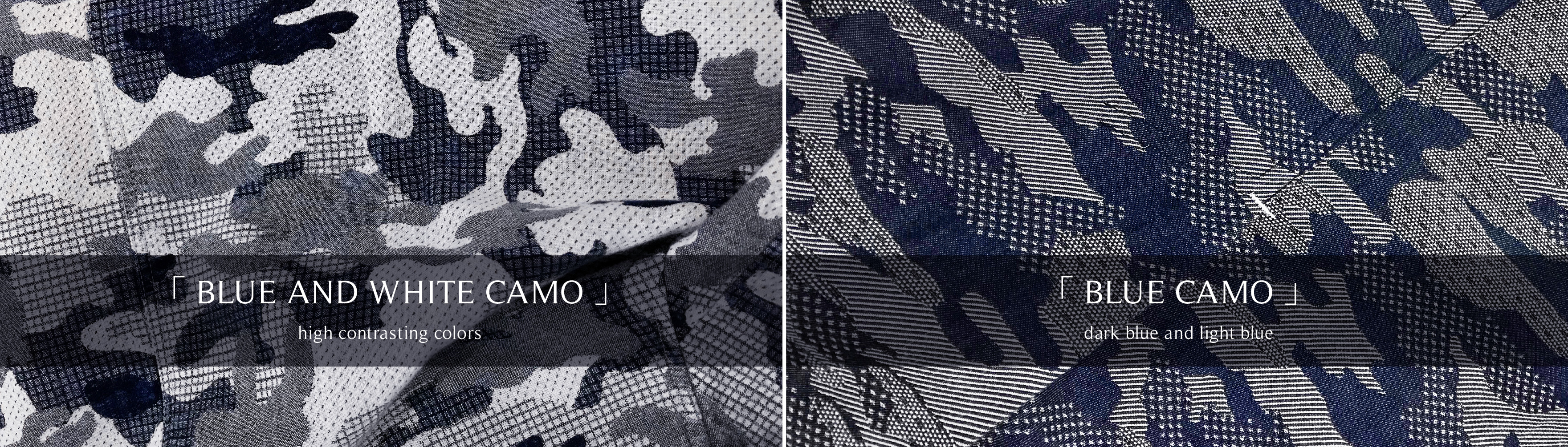 較深藍色的「 BLUE CAMO 」一直是穿搭好用花色之一,偏暗的色系與黑色搭配更能突顯迷彩特色,卻不會變成太過突兀的效果,很適合直接做大面積的外搭使用,而偏長版的襯衫、西裝外套也具有修身功能,也建議露出一點腳踝效果更佳。