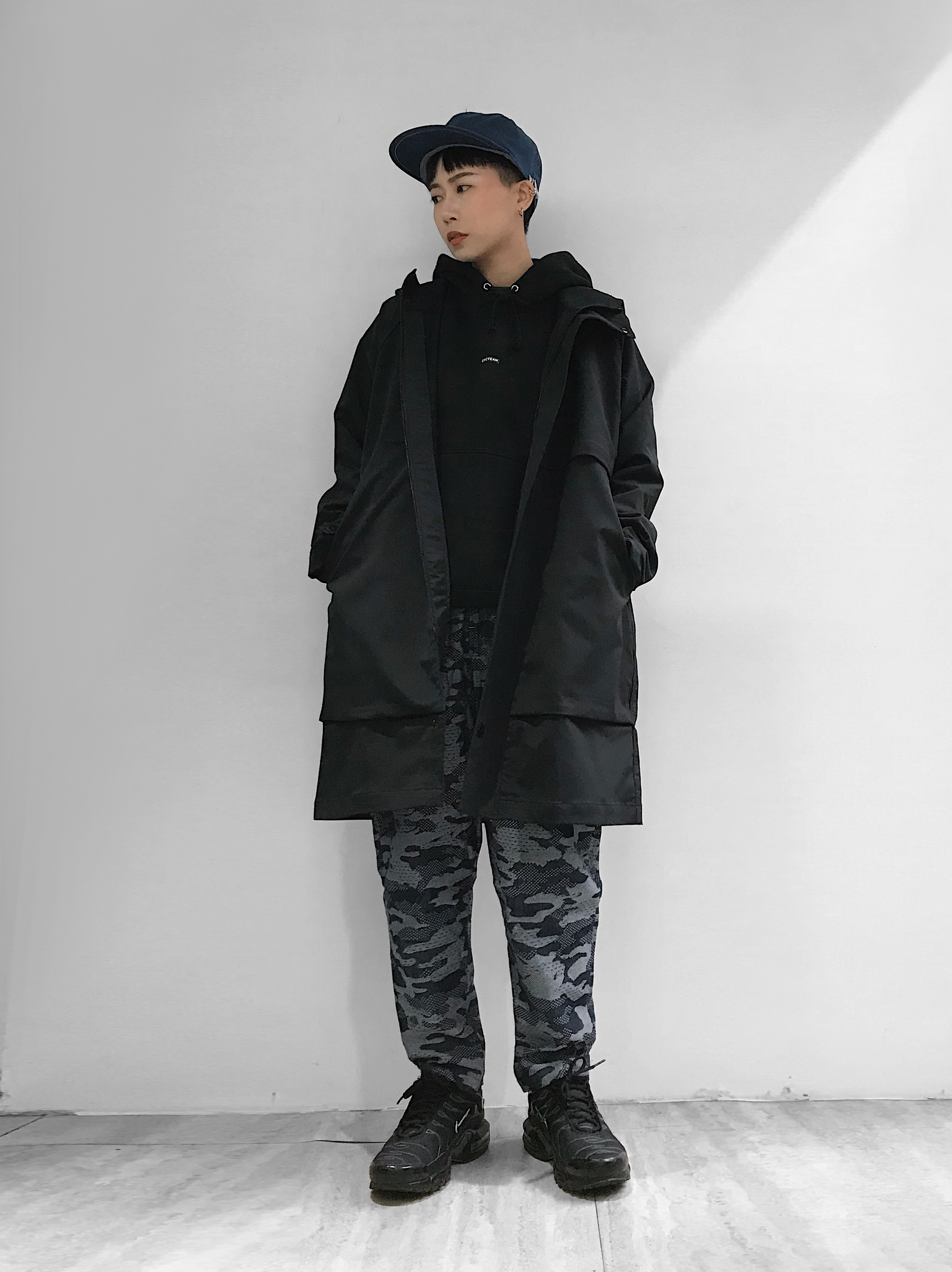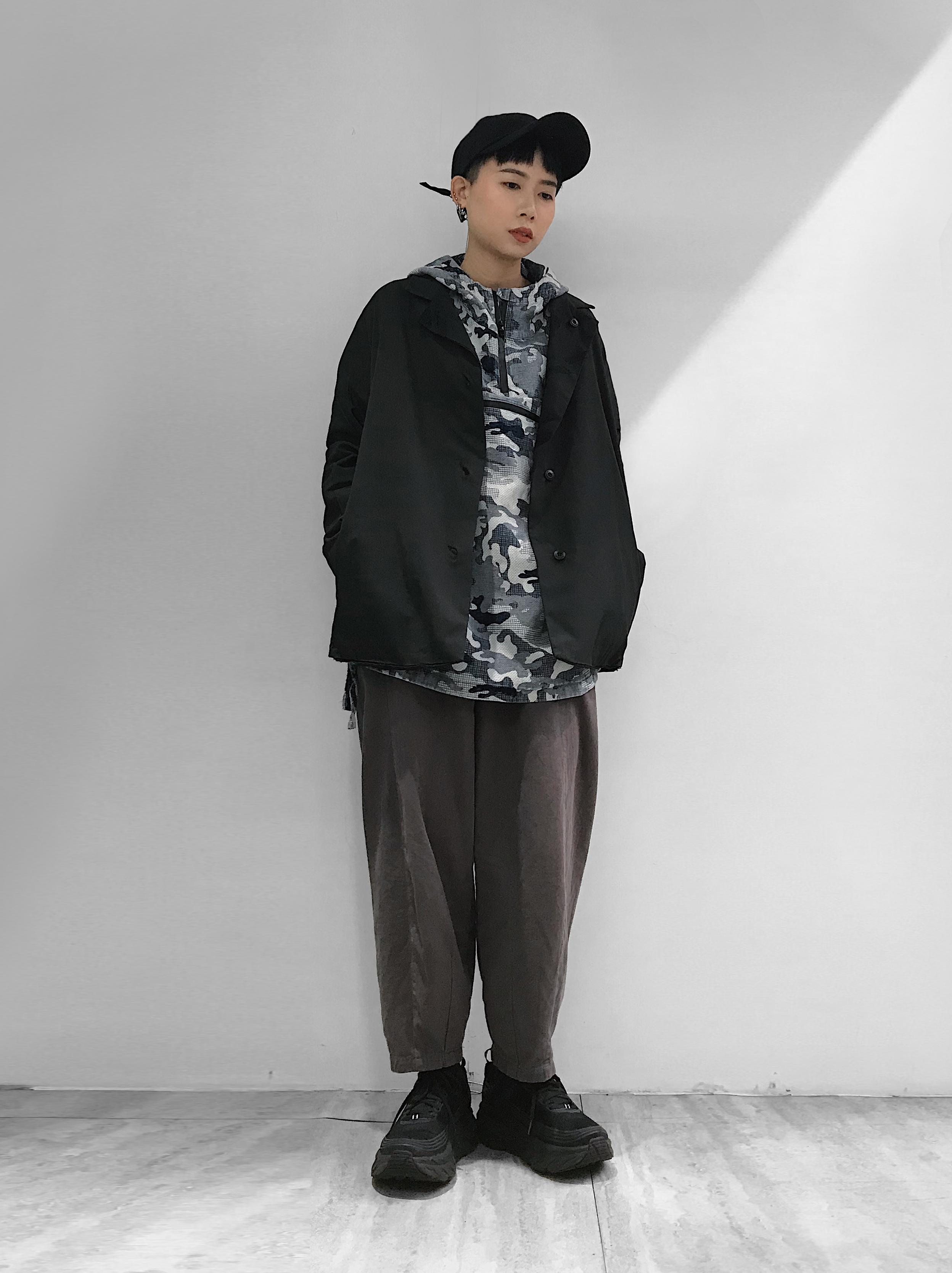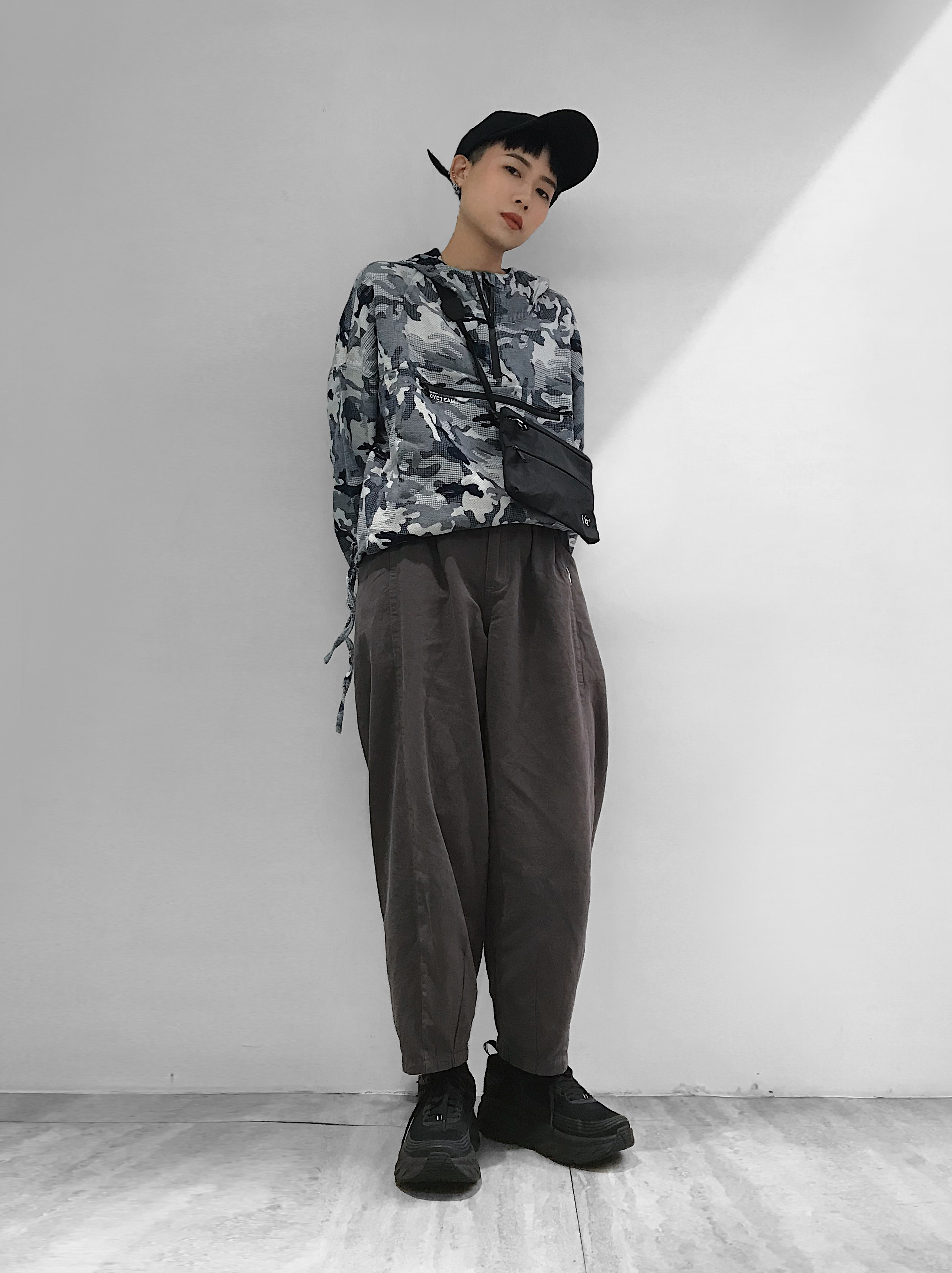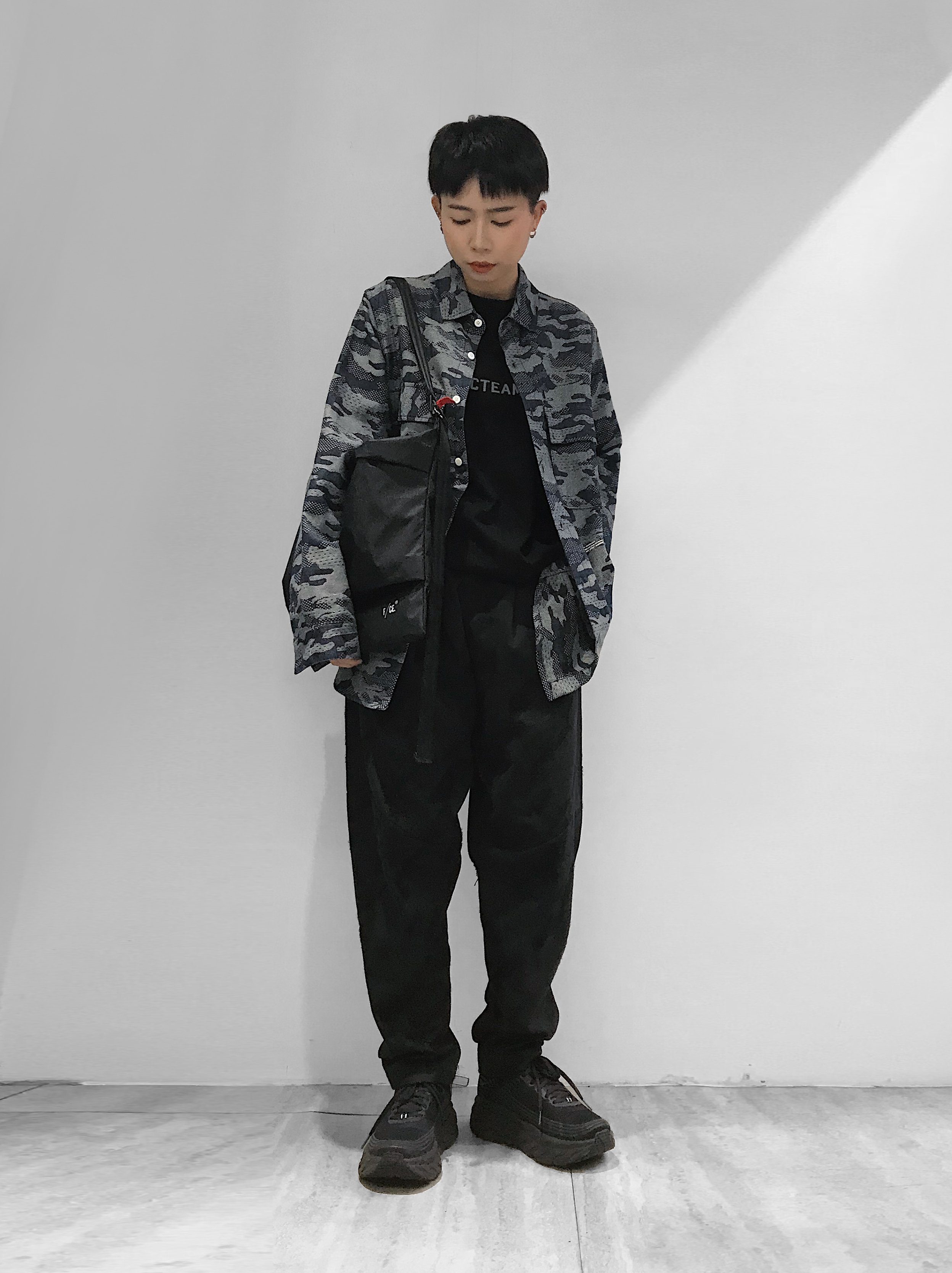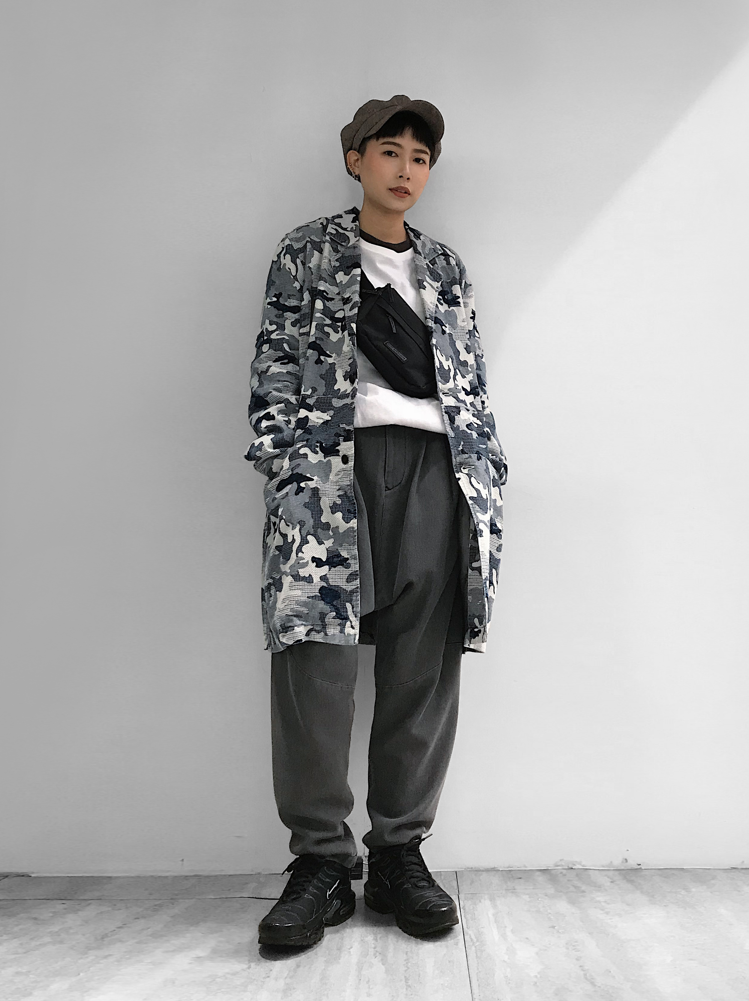 若比較不敢穿大面積迷彩的人可以嘗試將上衣紮入、或者搭配外搭來掩蓋部分範圍,把大面積圖案轉為點綴,既能夠表現穿搭重點,也能使穿搭更有層次。
