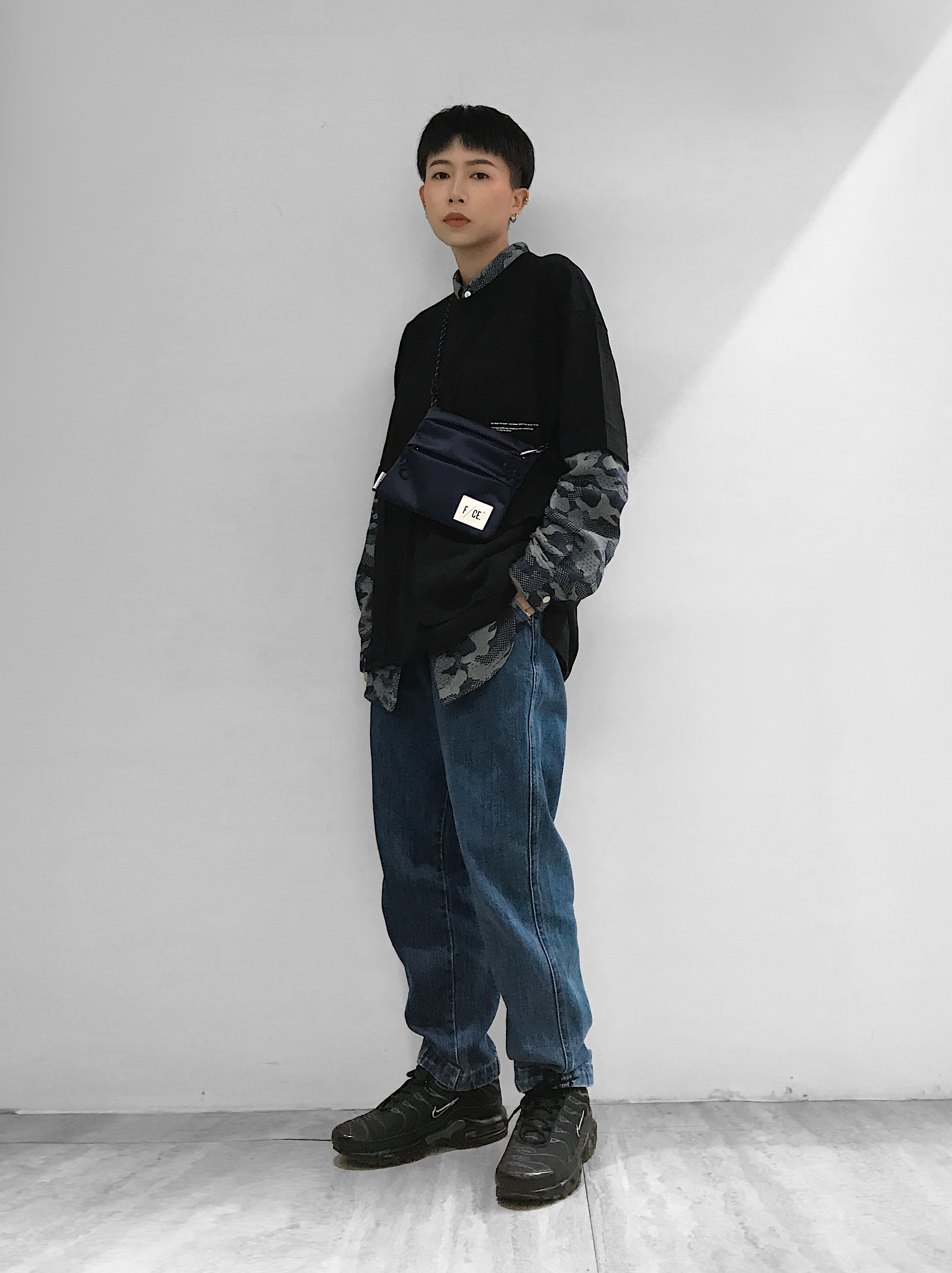 迷彩也很適合用來直接做內搭,外搭罩一件寬鬆TEE來呈現拼接棒球袖樣子,小面積露出亦能達到點綴效果,擔心太花俏的夥伴可以試試這樣的穿搭法。