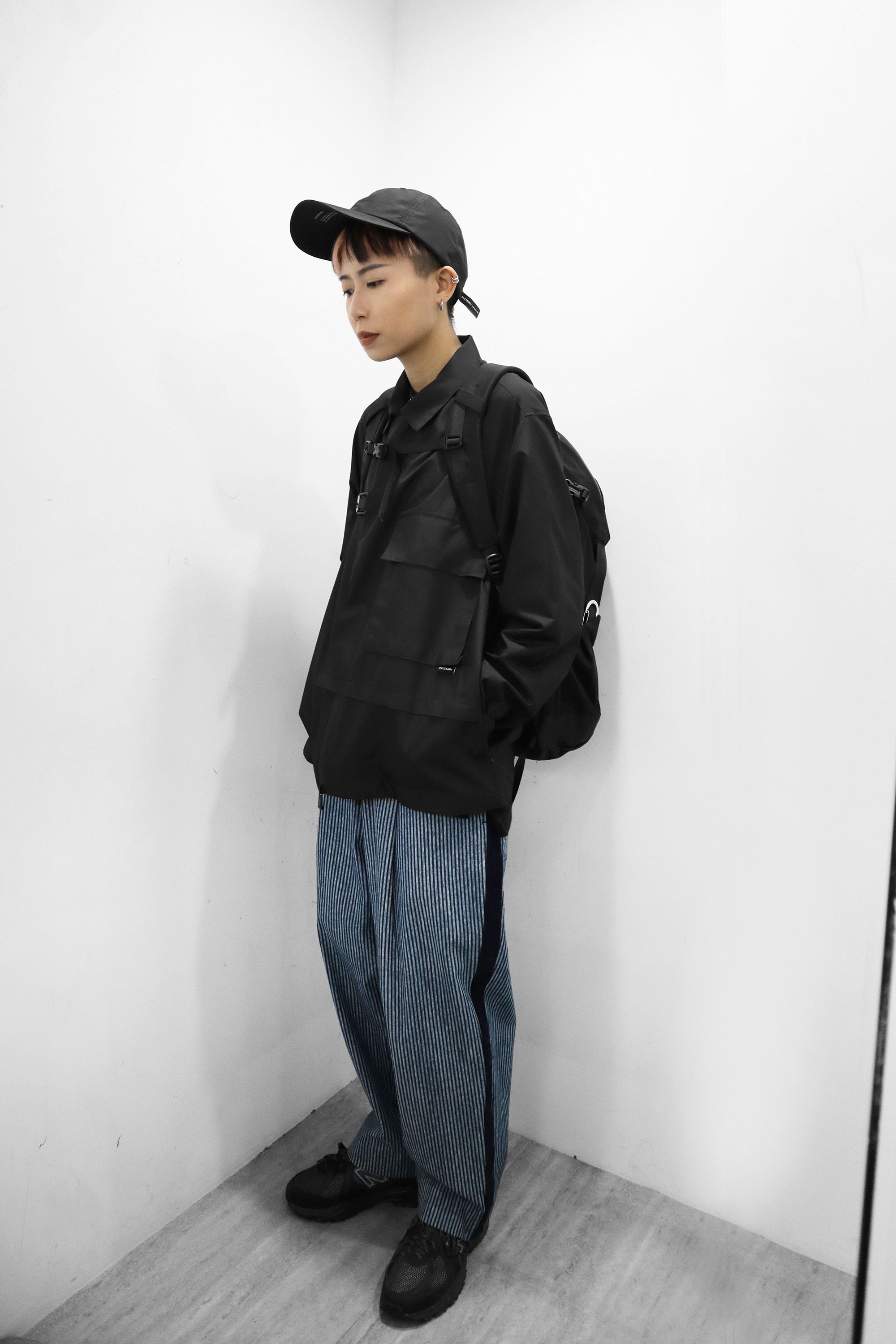側拼接條紋寬版褲有別於過去褲型,喜歡穿寬版、直筒的朋友可以直接參考這款;上身外套不對稱拼接讓服裝更有層次,與SEALSON秋冬新品後背包搭配城市機能感十足!