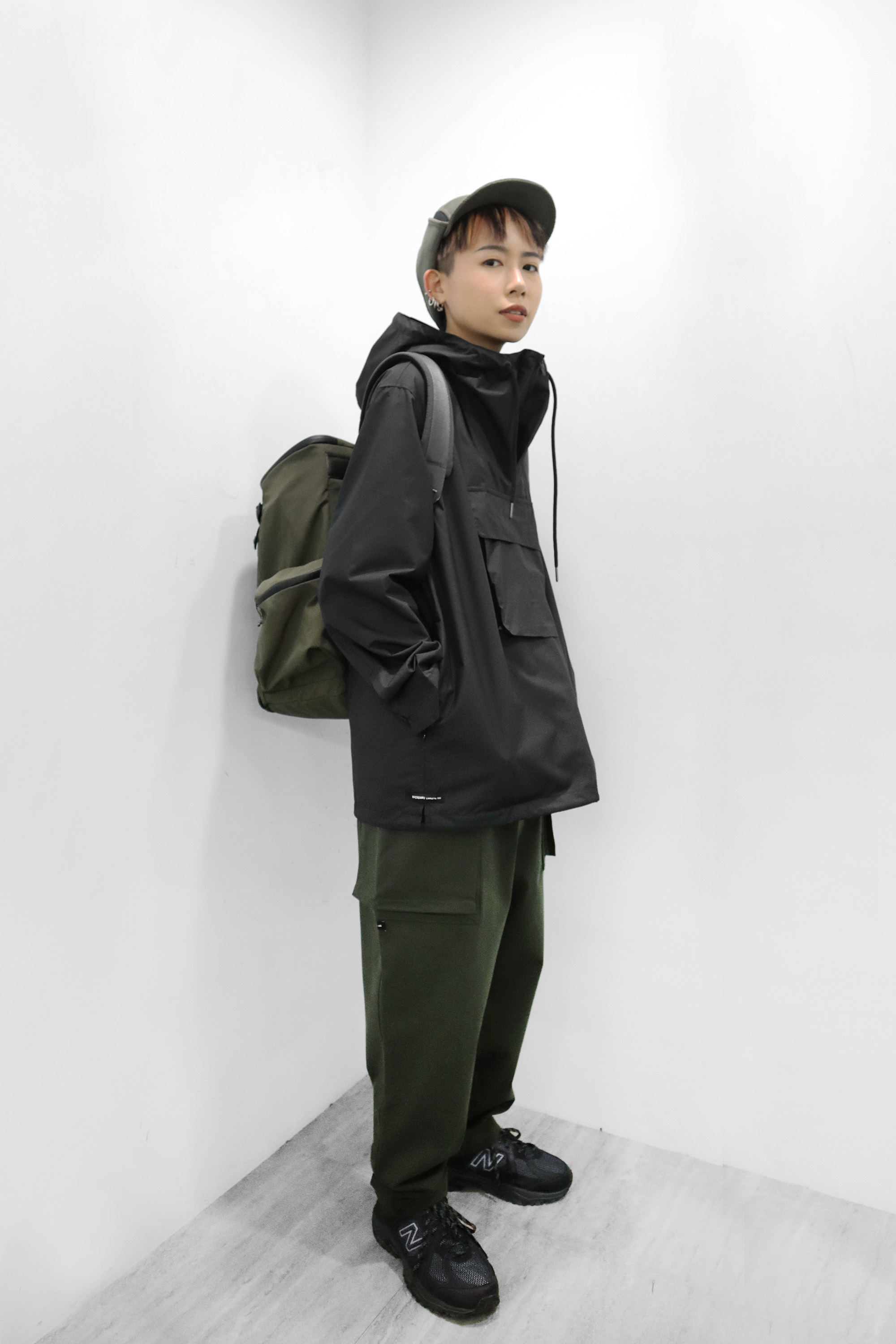 黑色與綠色是非常好搭的兩色,上身這款衝鋒衣除防潑水以外,內層防水透濕貼合,可做為戶外活動防水裝備之一,寬版版型也能夠在內層添加保暖貼身衣物;下身大口袋寬版長褲的搭配也很合適,順帶推薦大容量TOPOLOGIE背包,兩天一夜也足夠使用。