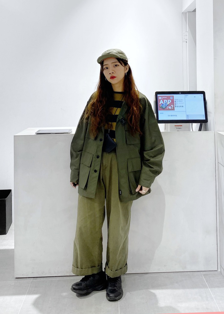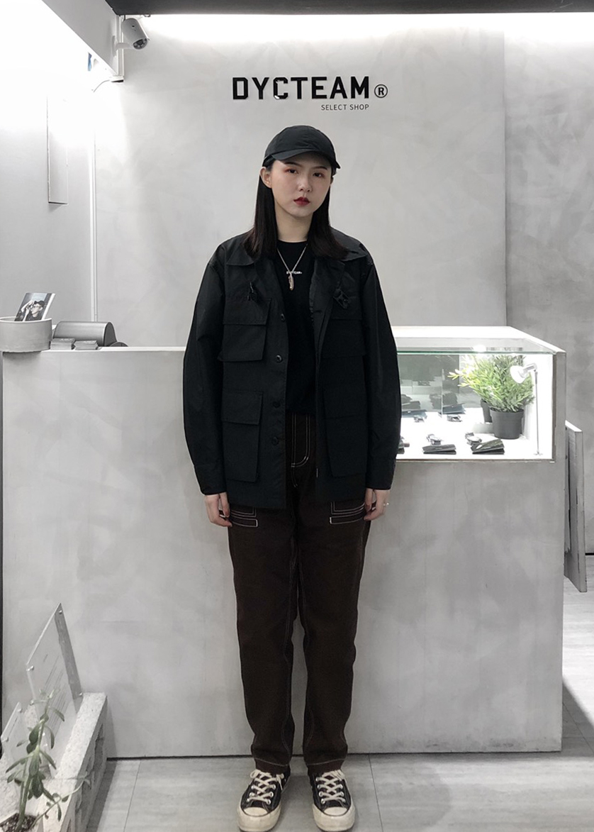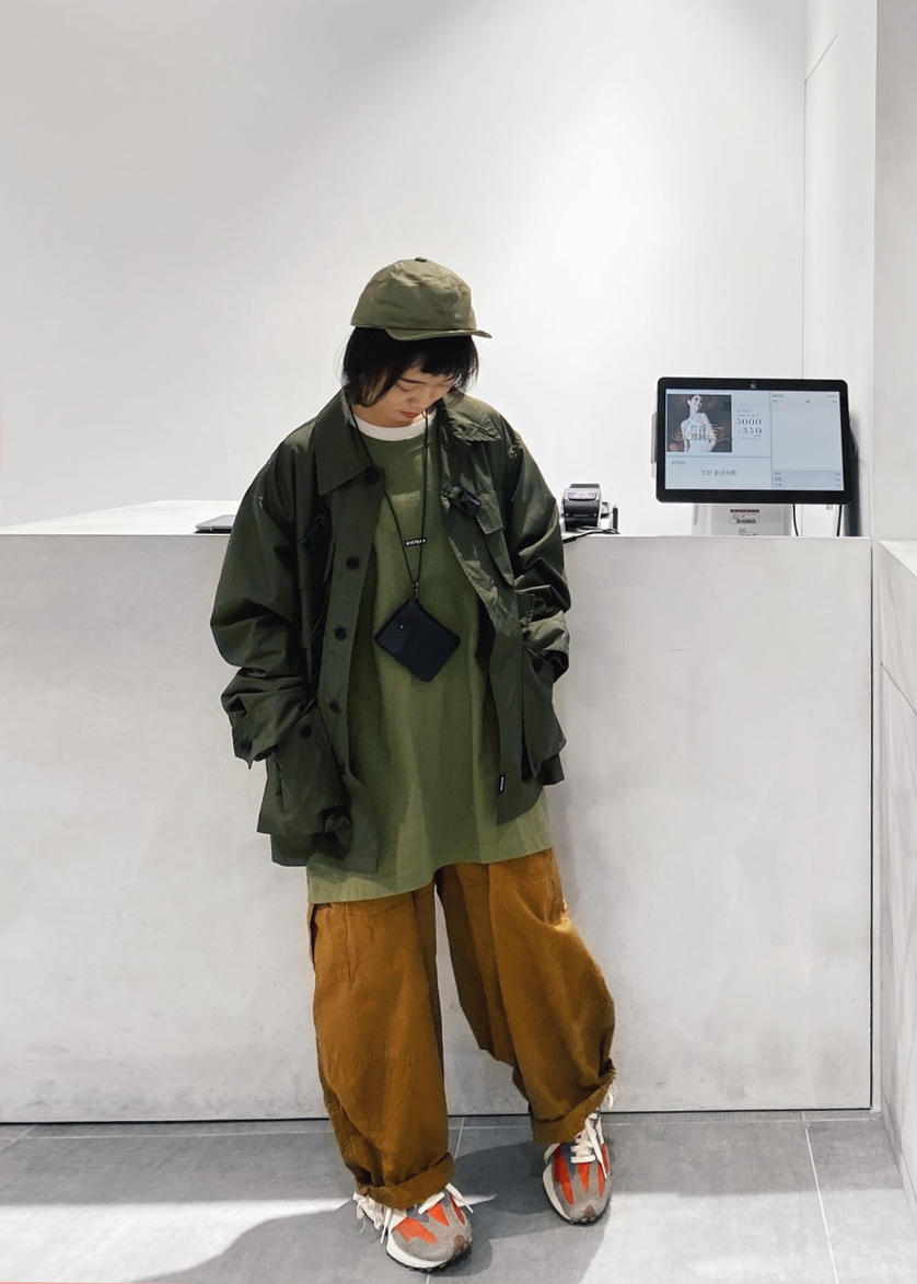 STAFF一律推薦同色系穿搭!整套著裝後更顯個性、氣場,選用寬鬆的下身與上衣呼應,呈現OVERSIZE風格,內裡只要著簡單的素TEE、搭配小飾品,便能快速出門!多口袋的視覺已經很強烈,就不太建議多層次穿搭。