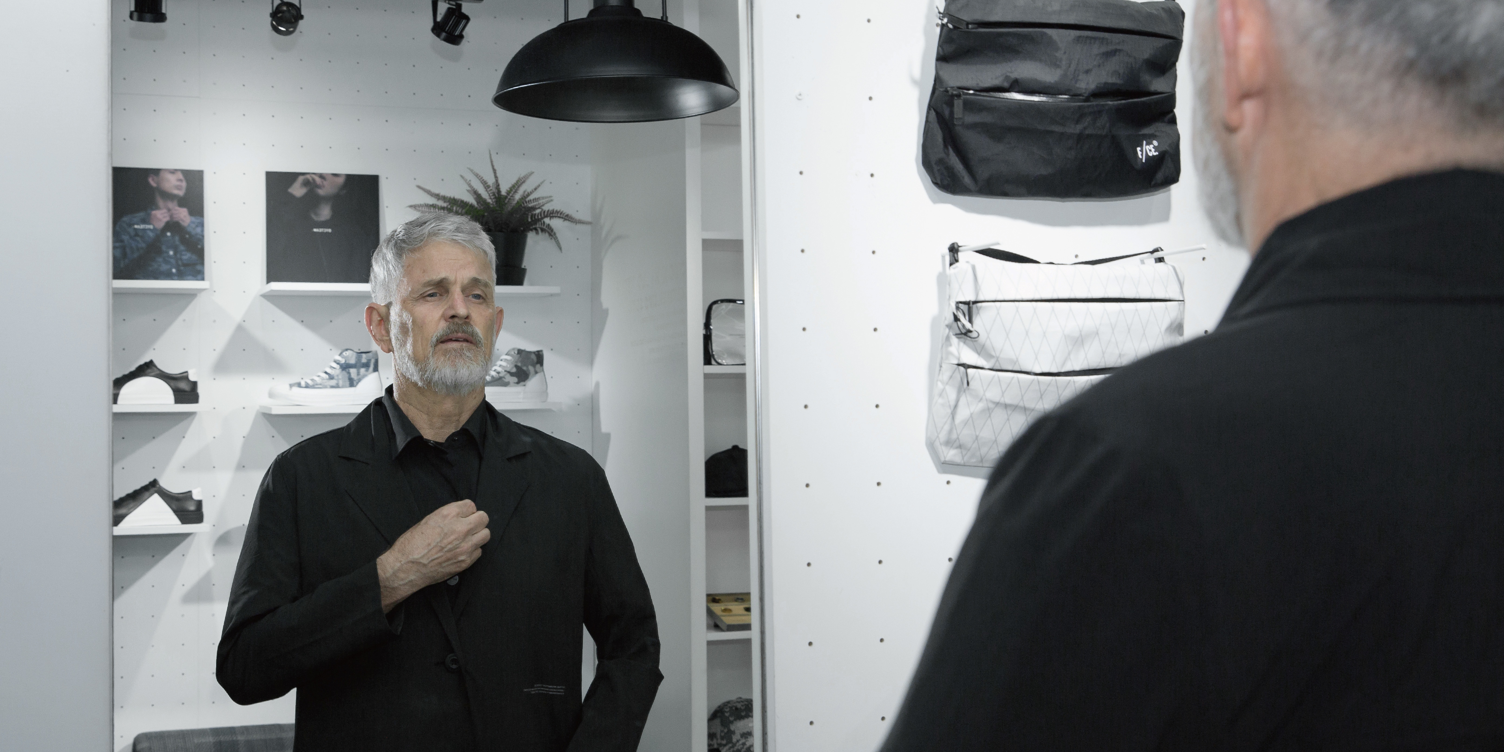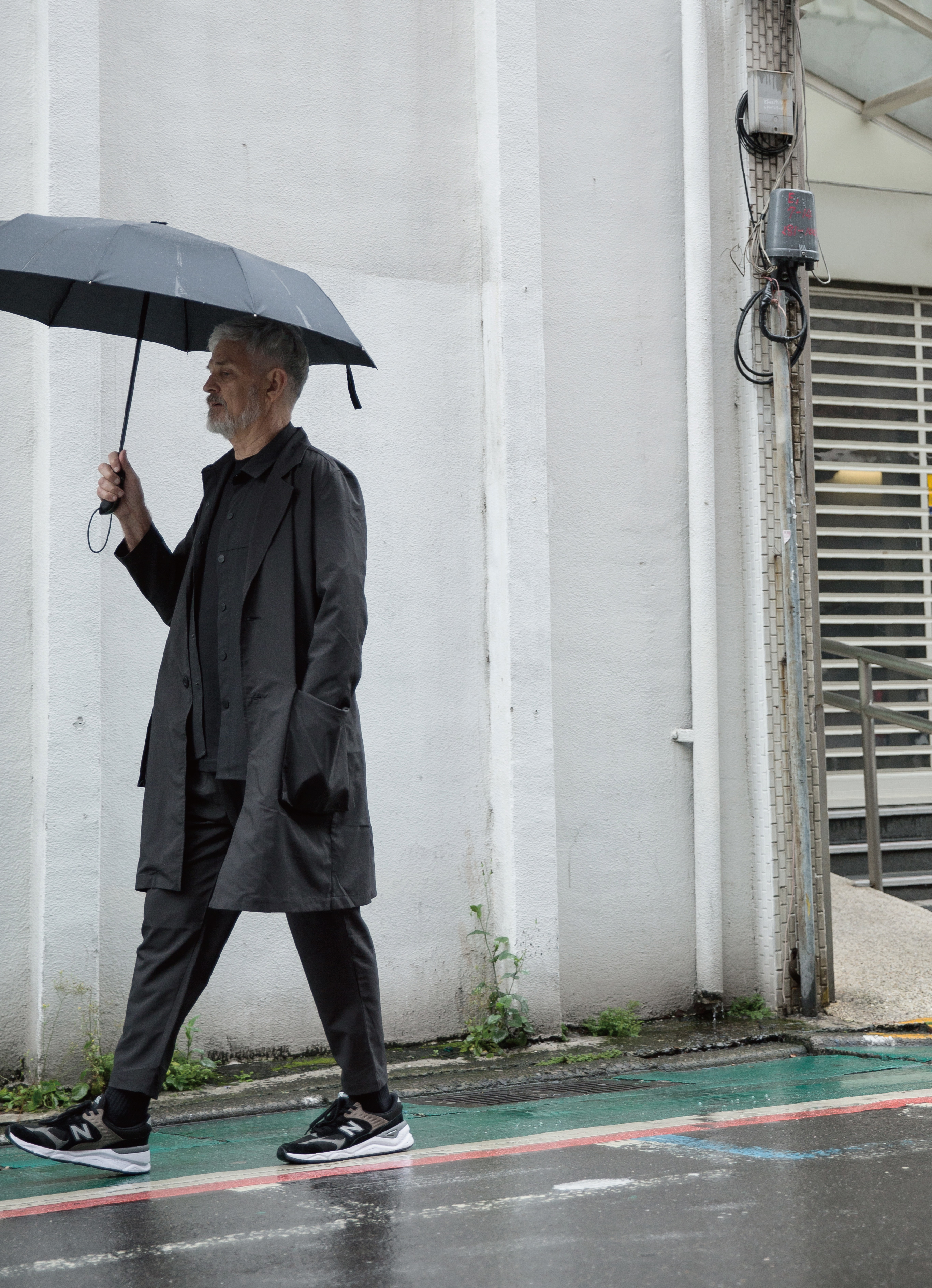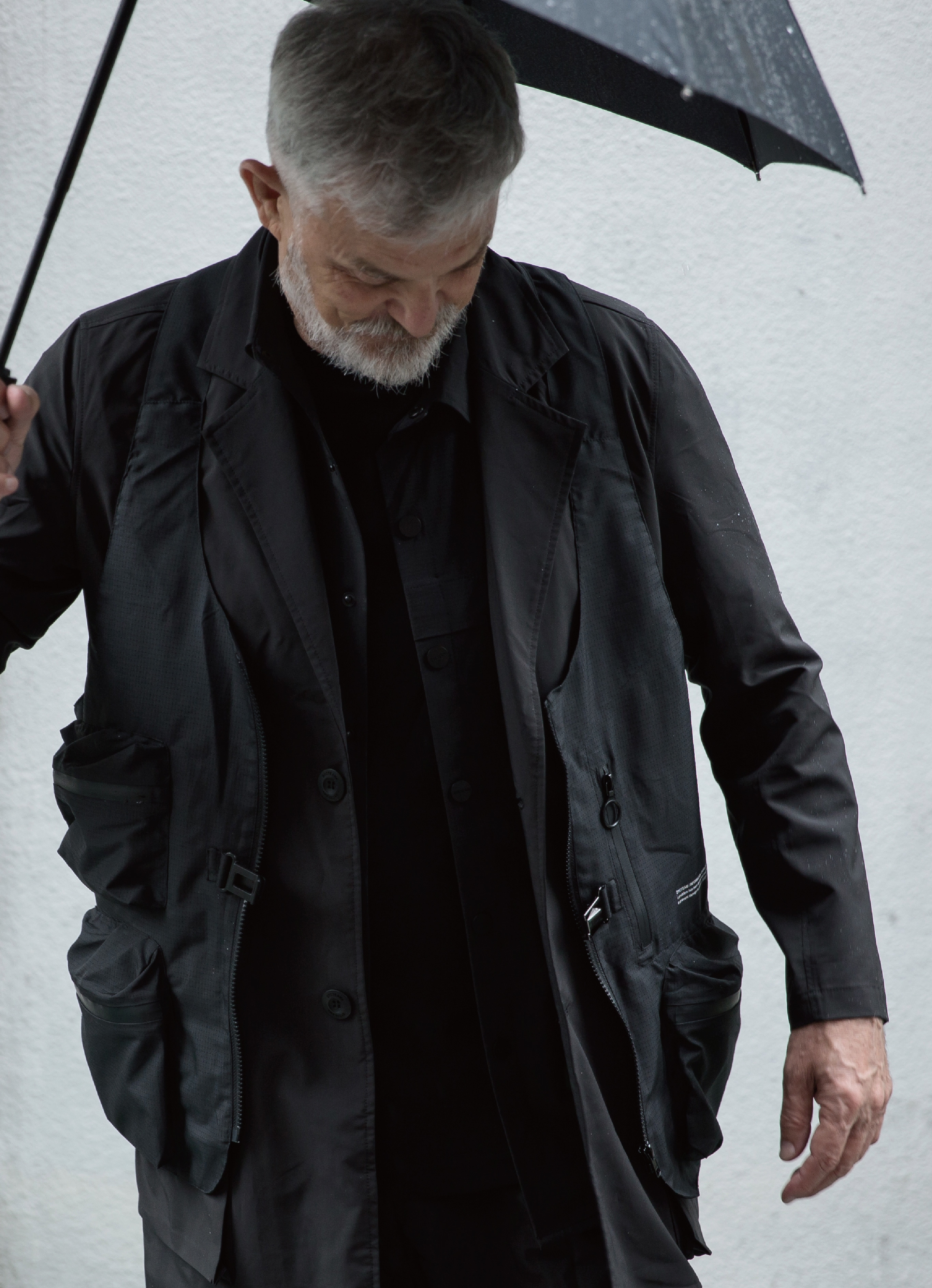 全黑系是最安全的穿搭卻也是最危險的穿搭,如何在黑嚕嚕中做出層次也是一門大學問。DYCTEAM在本季的BASIC系列開發了兩款防潑水機能面料,即便皆為黑色卻有細小紋路的差別,除了使用長短層次的穿搭變化外,加入不同面料的拼湊也是全黑系的要領之一。